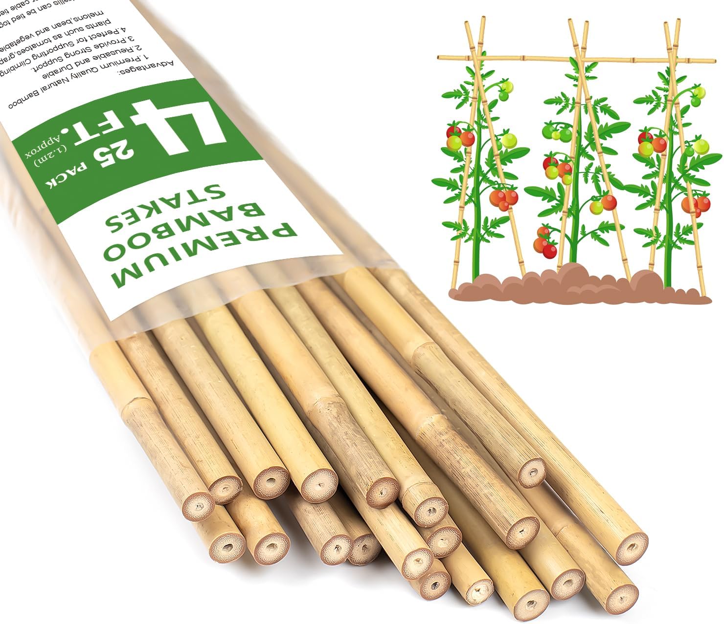 Plant Stakes 4FT, Natural Bamboo Stakes, HAINANSTRY 25Pcs Sturdy Bamboos Garden Stake, Bamboo Sticks for Plants, Beans, Indoor and Outdoor Climbing Plants, Tomato Vegetable Stakes for Garden