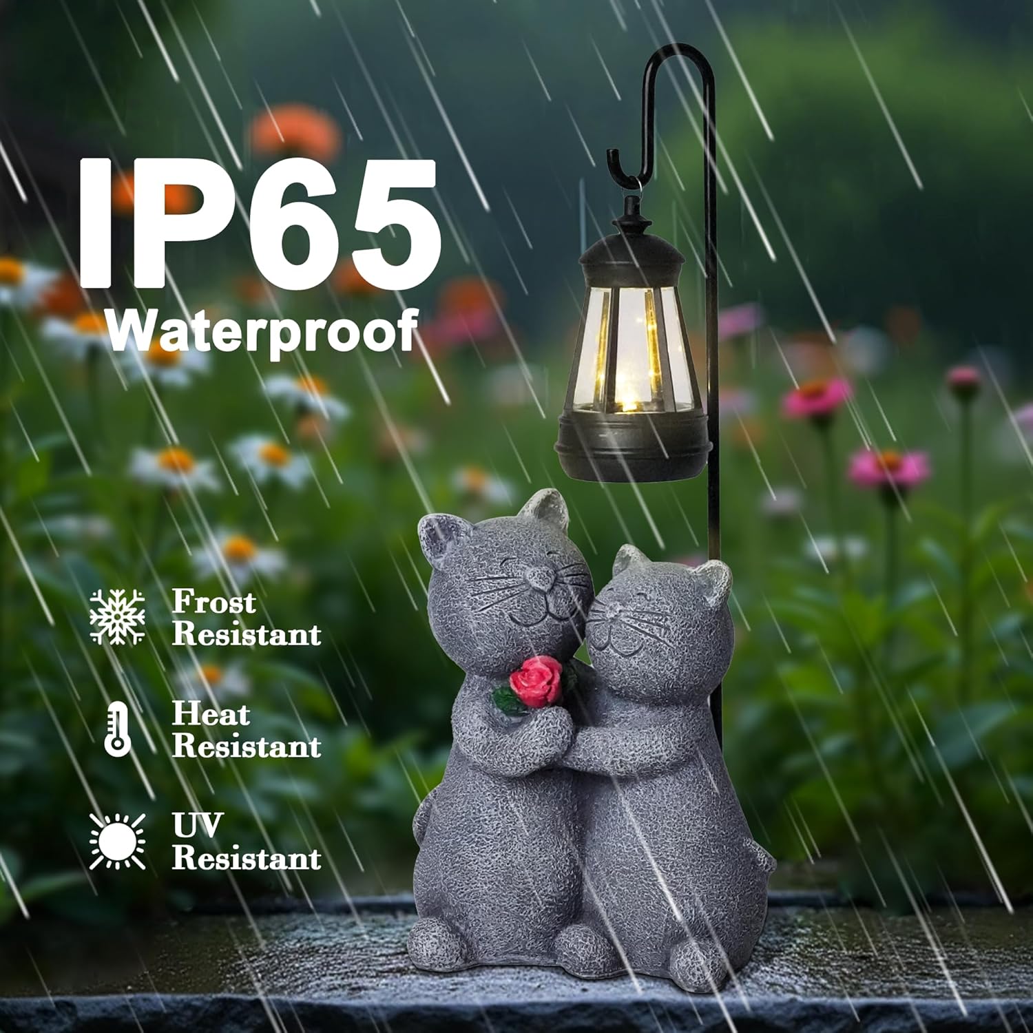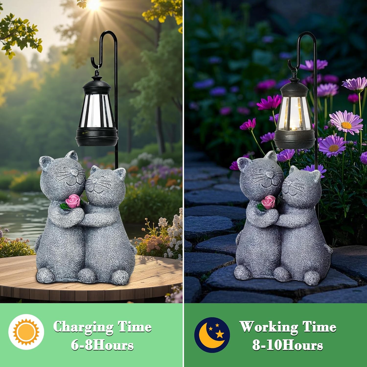 • 【Adorable Cat Couple Design】 – This solar cat garden statue features a sweet cat couple holding a rose, symbolizing love and companionship, adding a warm and heartfelt touch to your home