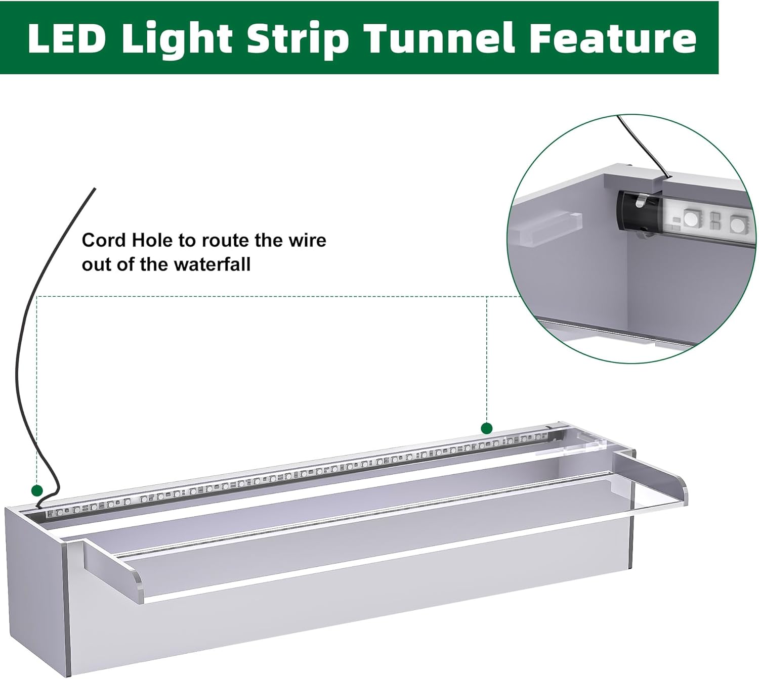 • 【Garden & Pond Decoration Waterfall】- The LONGRUNNEW waterfall spillway adds decorative elegance and beauty to gardens and pools. Optional color-changing LED light strips, sold separately, create a special ambience at night. The gentle sound of the cascading water enhances outdoor patios. Note: LED light strips are not included with the waterfall but can be purchased separately in our store.