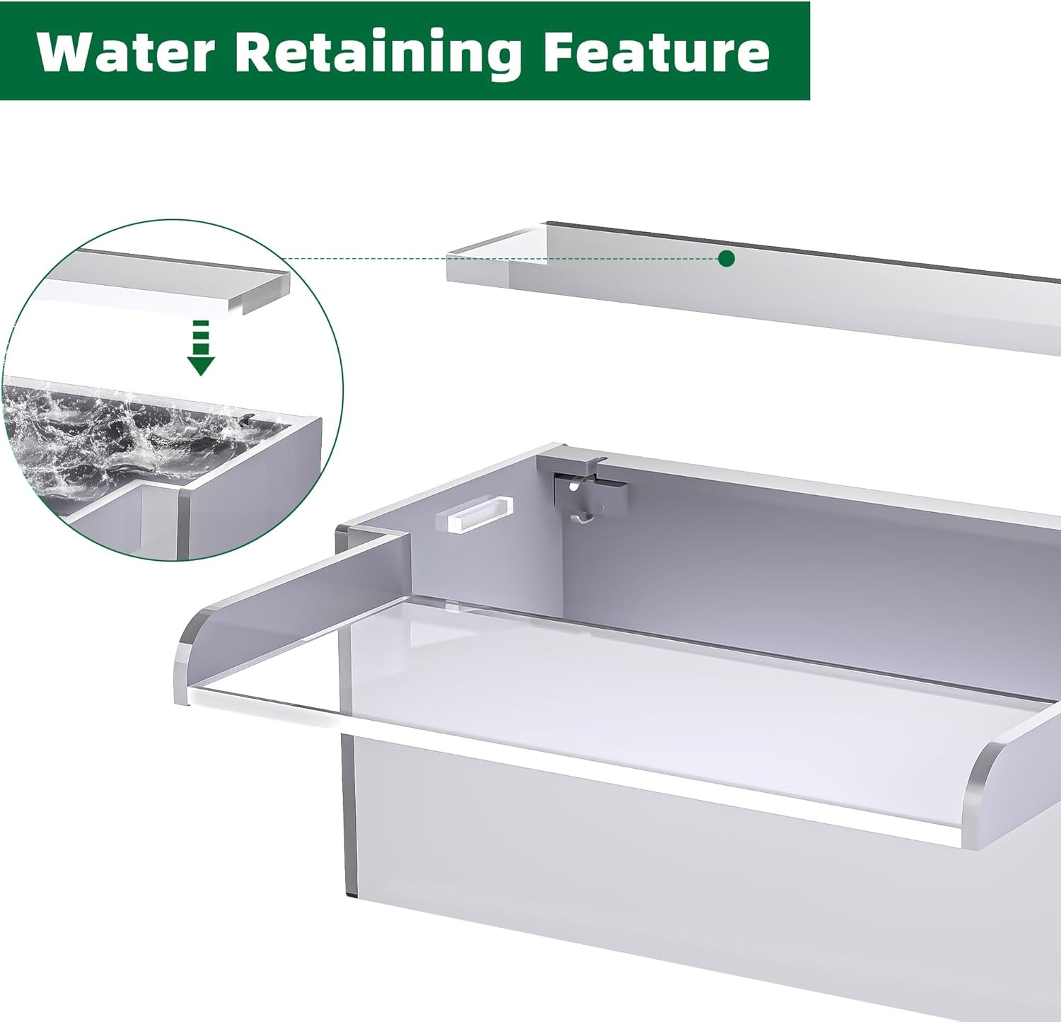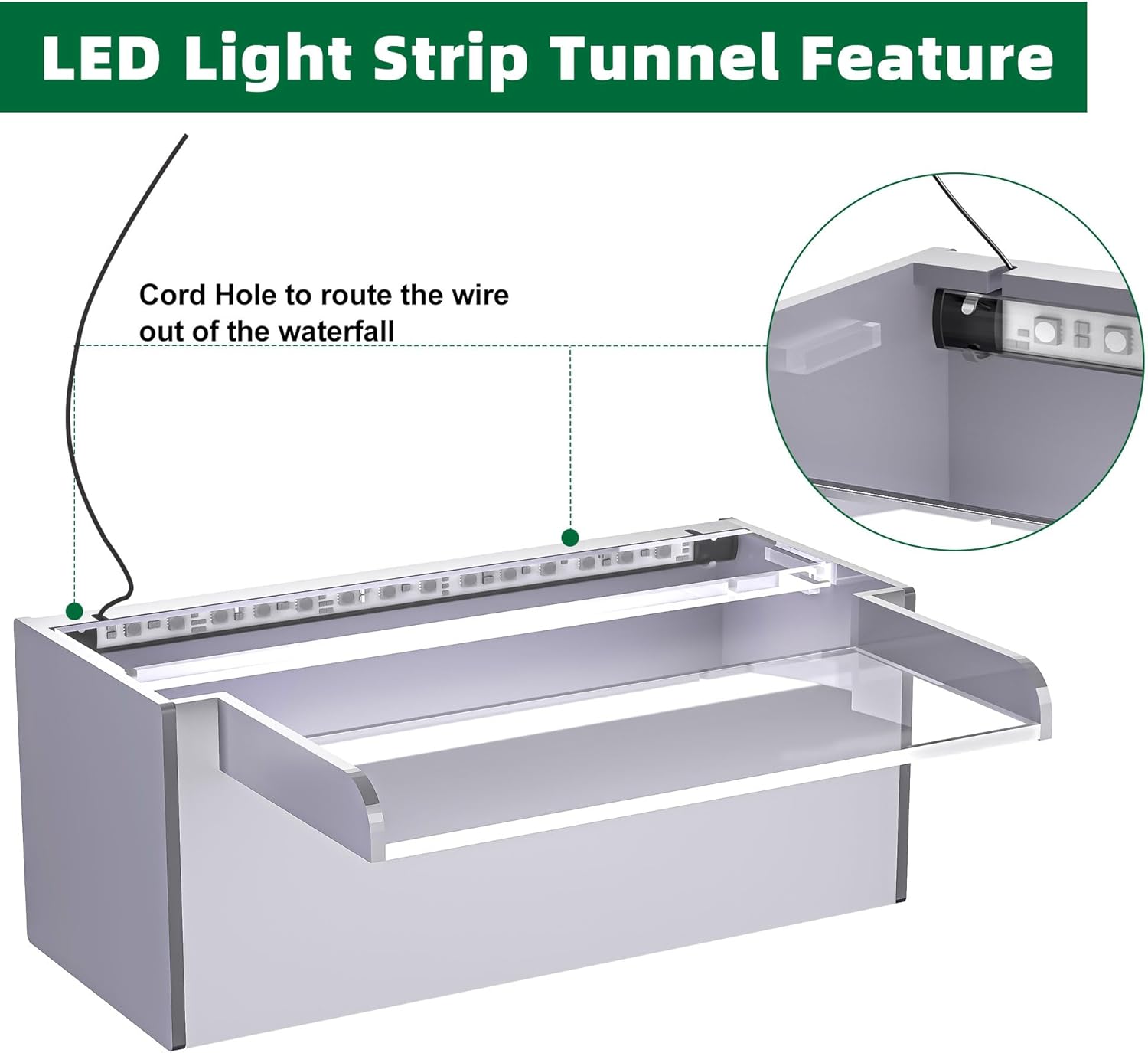 • 【Enhanced Upgrade Design】- This upgraded design includes a specialized channel for the LED light strip and two cable outlets to neatly route power cables, keeping them hidden from view. Ideal for those who want to add an LED light strip separately. To further enhance functionality and efficiency, a splash guard has been integrated at the open top of the waterfall. Additionally, a precisely positioned baffle at the water inlet ensures regulated and optimized water flow, creating an appealing visual effect while reducing unwanted splashing.