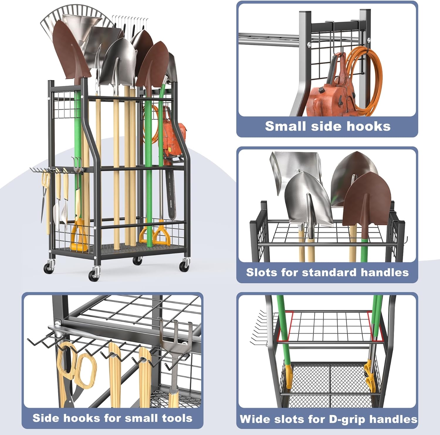 • Portable Design with Wheels: Easily move garden tools around your yard or garage with this wheeled organizer. Ideal for solid floors, the wheels offer flexibility that wall-mounted racks lack, allowing you to roll the cart close to your work area or outside