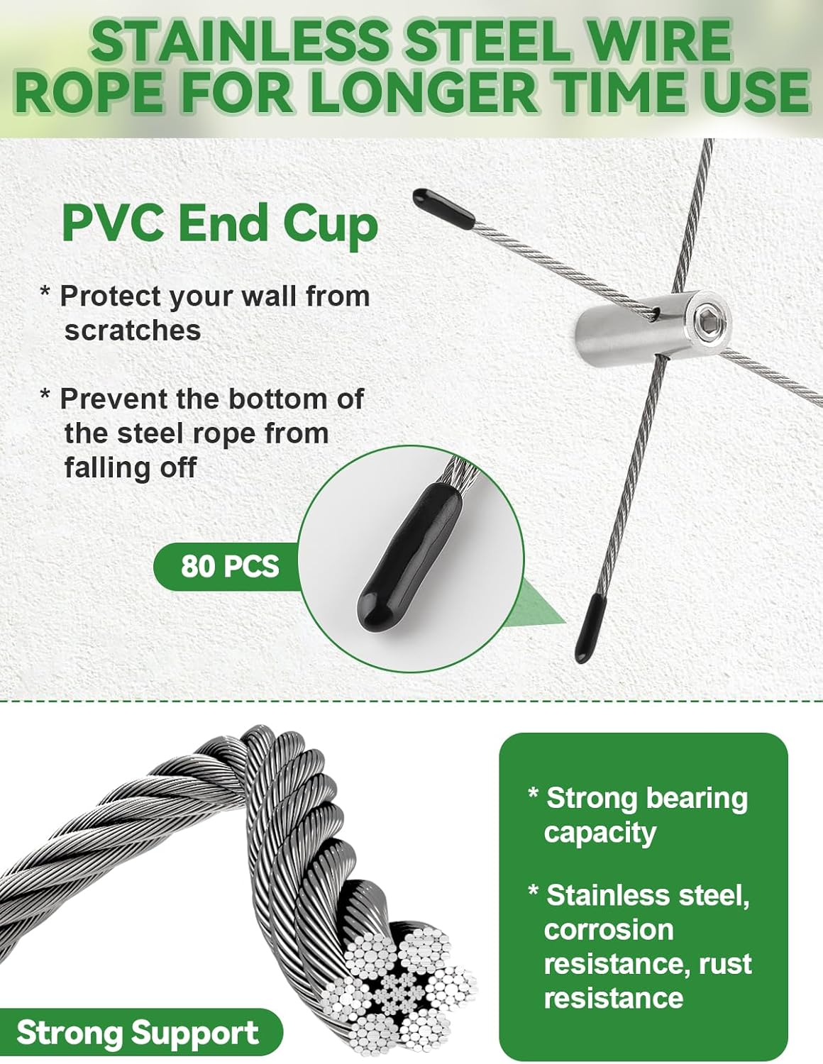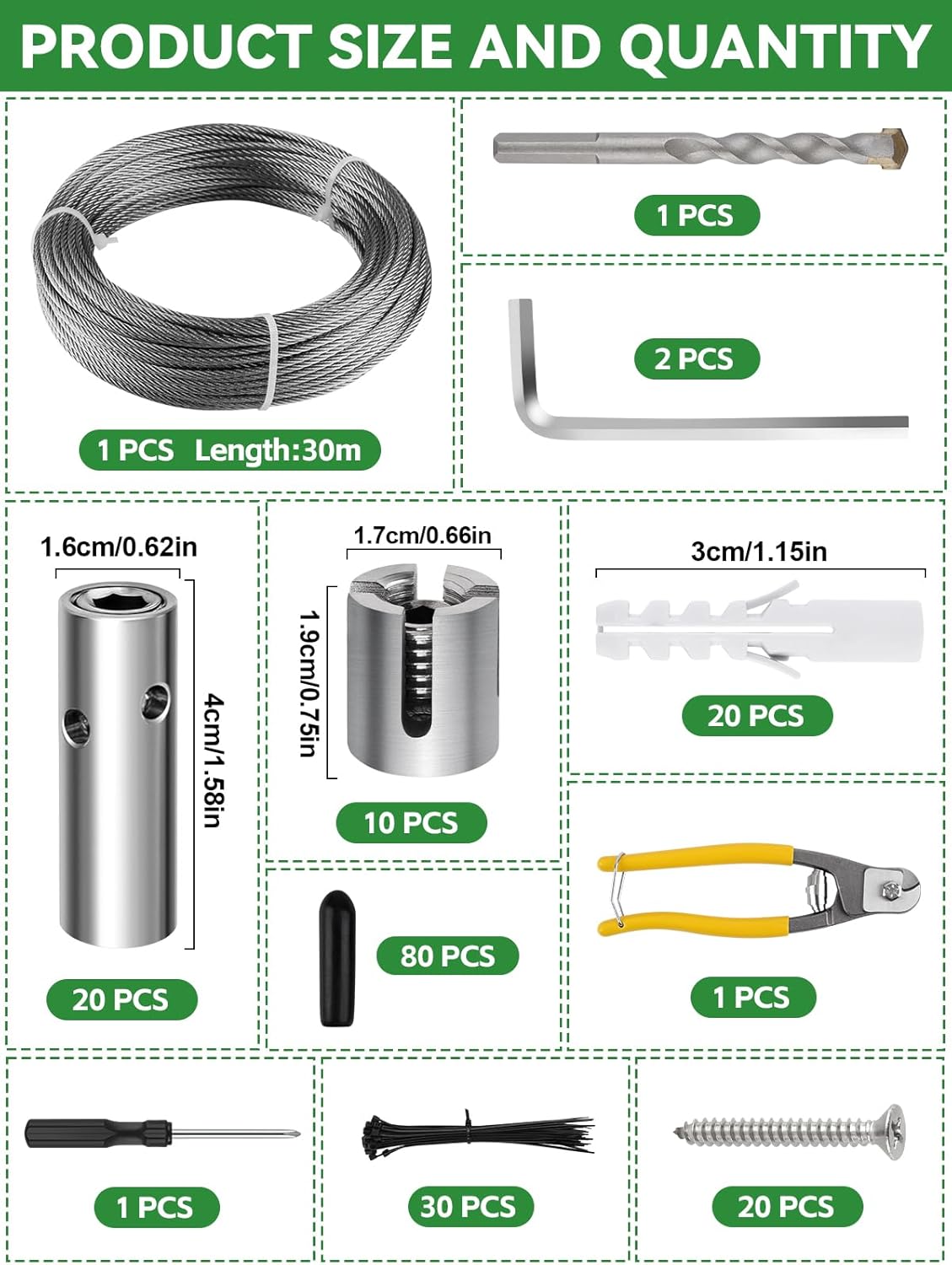 • What You Will Get: 20PCS Classic Heavy-Duty cylindrical standoffs, 100ft x 1/8in wire rope, 10PCS cross cable clamps, 20PCS screws, 20PCS plastic expansion anchors, 30PCS plant ties, 80PCS PVC end caps, 1PCS screw driver, 2pcs all-purpose spanner, 1PCS matching drill bit, 1PCS cord cutter(The color is random.) and 1PCS instruction manual.