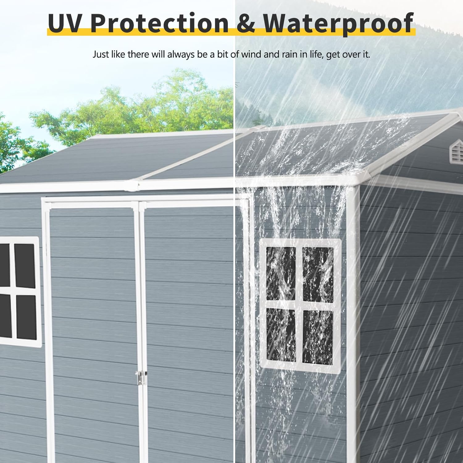 • 🏠 Durable & Weather-Resistant Construction: Crafted from premium resin materials, this 8x6 ft outdoor resin storage shed offers outstanding durability and weather resistance. Its UV-resistant surface prevents fading from sun exposure, ensuring vibrant color and long-lasting performance. Perfect for storing garden tools, patio furniture, and outdoor equipment year-round.