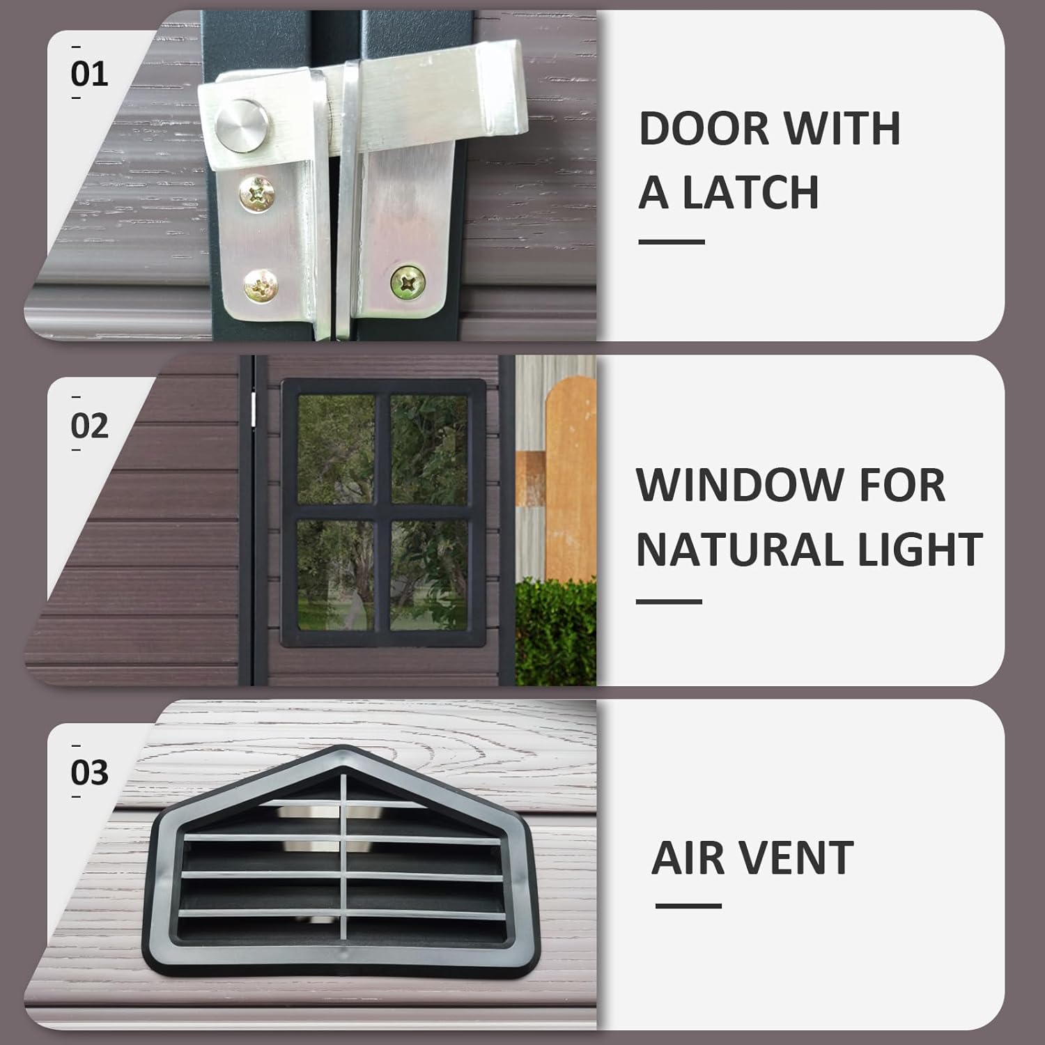 • 🛖 Enhanced Ventilation & Natural Light: Designed with two air vents, this resin storage shed ensures optimal airflow, keeping the interior fresh and dry. Two built-in windows allow natural light to illuminate the space, making it easier to organize and access your items.