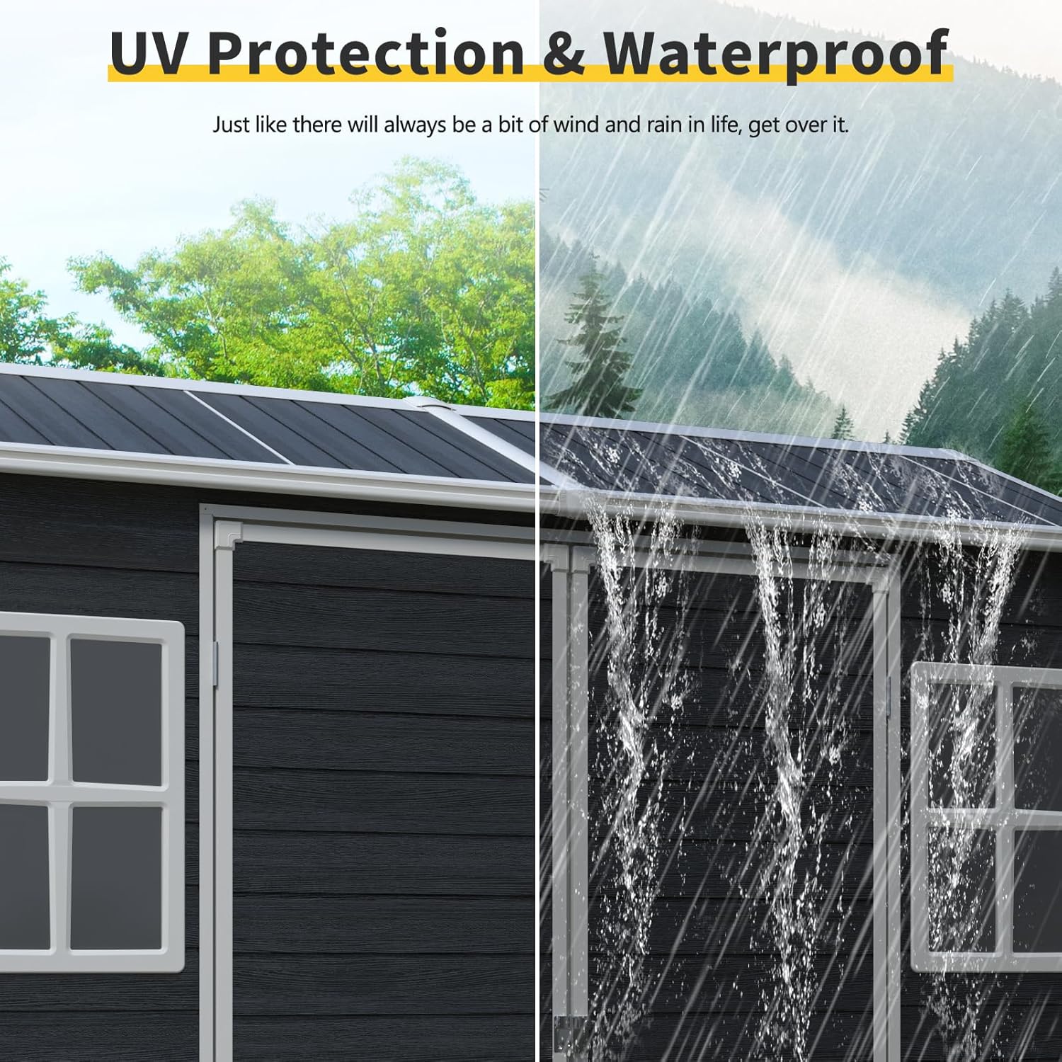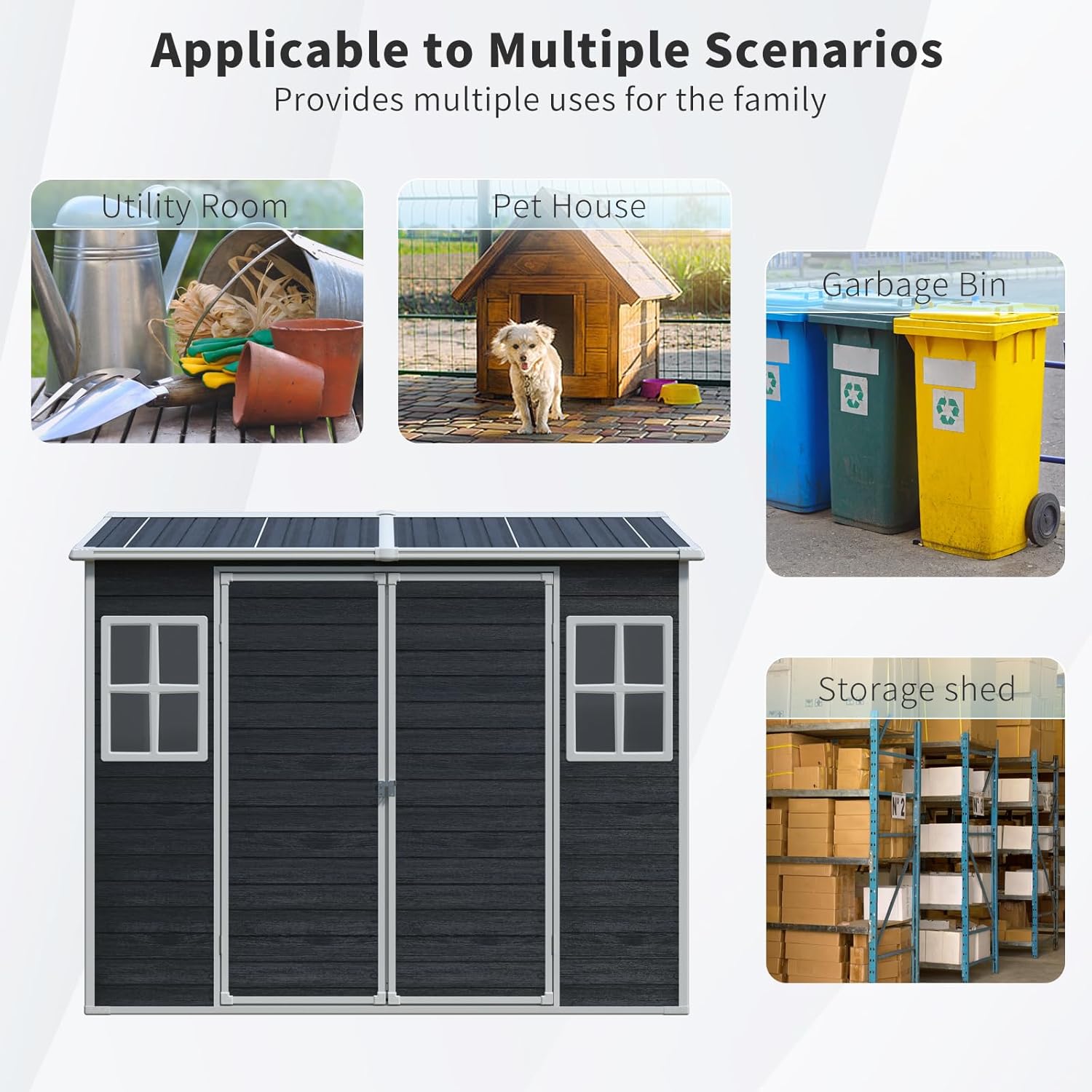 • 🏠 Durable & Weather-Resistant Construction: Crafted from premium resin materials, this 8x4 ft outdoor resin storage shed offers outstanding durability and weather resistance. Its UV-resistant surface prevents fading from sun exposure, ensuring vibrant color and long-lasting performance. Perfect for storing garden tools, patio furniture, and outdoor equipment year-round.
