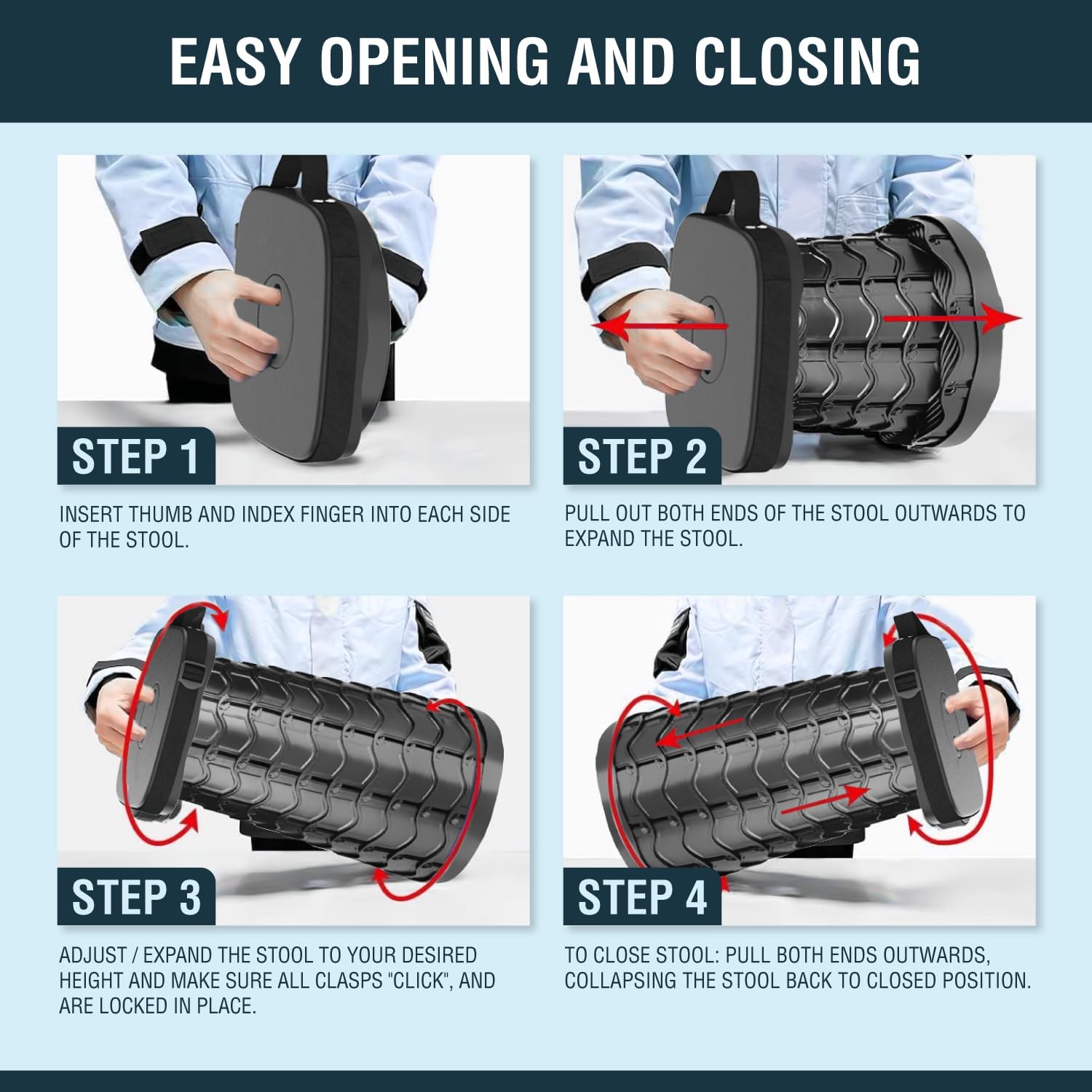 • 😇【PORTABLE SEAT SIZED FOR EVERYONE】Enjoy a Sturdy, Strong, Lightweight Retractable Folding Stool. Our Portable Travel Seat can support up to 620lbs. Fully collapsed/closed, your Portable Collapsible Stool is only 2.5 x 10 in., but will expand up to 18 in. tall or to your desired adjusted height.