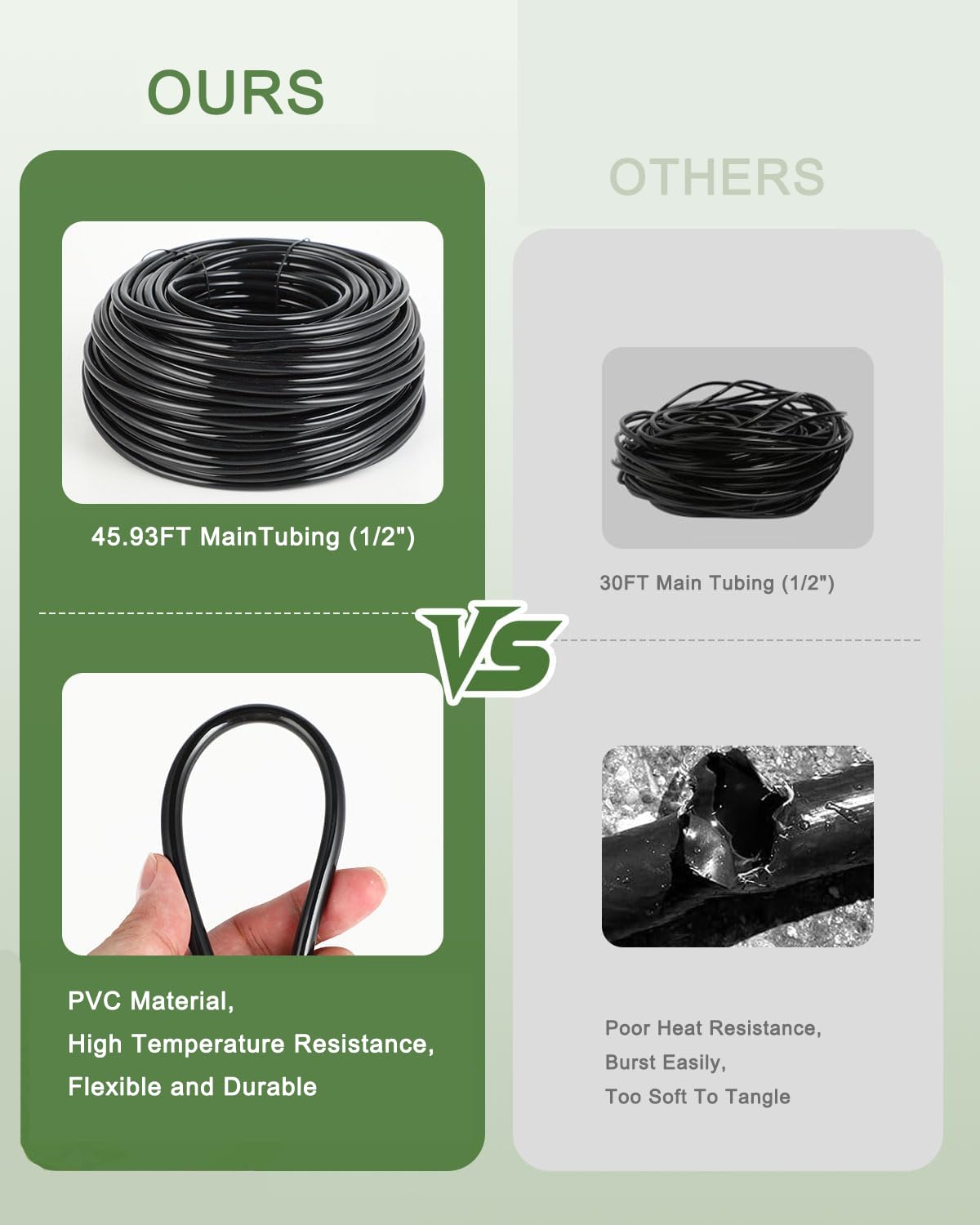 • 🌱 Reliable Water Supply for Your Entire Garden: This upgraded irrigation system connects directly to your water source via a female coupler and uses 1/2" tubing as the main line, branching out with 1/4" tubing to cover a wider area. The system supports up to 20 drip emitters, ensuring that all your plants—near or far—receive consistent and adequate hydration.