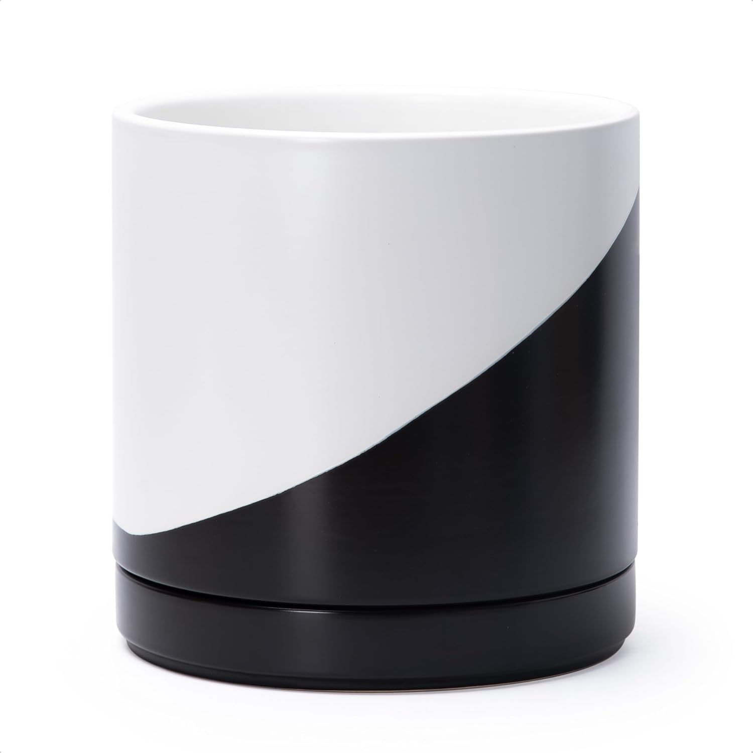 D'vine Dev 10 Inch Ceramic Planter Pot with Drainage Hole and Saucer, Indoor Cylinder Round Planter Pot, Oblique Monochrome Black and White, 94-O-E-K