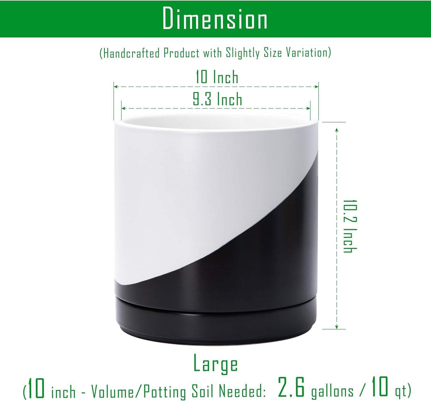 • Versatile Size Range: Offered in six sizes (3.5" to 11.8") to accommodate a variety of plants, from small succulents to large indoor greenery. Large 10 Inch Planter Pot: 10" Diameter x 10.2" H, Potting Soil Needed: 2.6 gallons / 10 qt.
