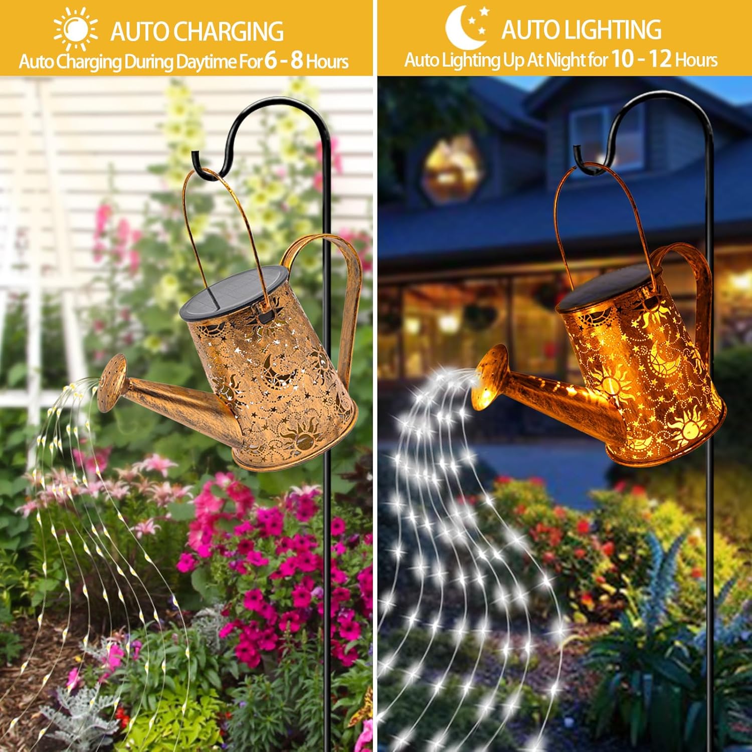 • Unique Solar Watering Can Lights with Sun&Moon Pattern - This Star Shower Garden Art is an eye-catching yard art for your home, base the popular watering can with lights pouring out design, we upgraded the solar lantern with unique sun and moon hollowed out pattern, will leave a lovely reflection pattern on the surrounding ground, make your garden outstanding