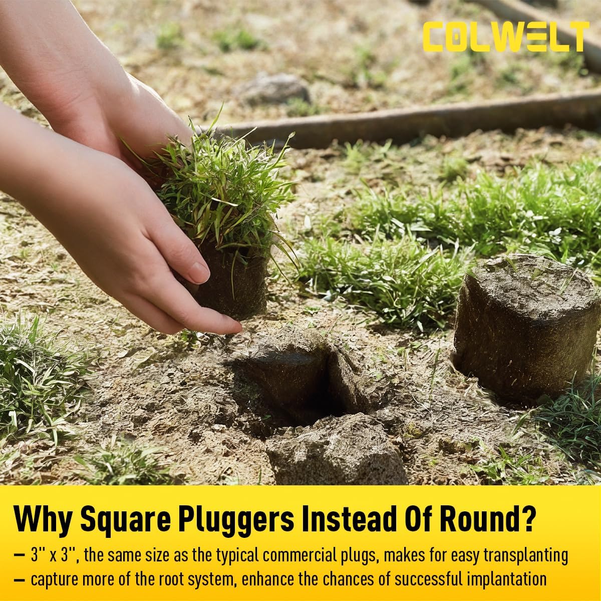 • CUTS A 3" X 3" SQUARE PLUG -- Colwelt grass plugger tool picks up a 3" X 3" square piece of sod or soil, the same size as the typical commercial plugs. What’s more, compared to round shapes, square design likely captures more of the root system, enhancing the chances of successful implantation. Assembly is quick and easy with instruction and all necessary fixings and tools. If you have any questions or need assistance, please don't hesitate to contact us. We are always here to help.