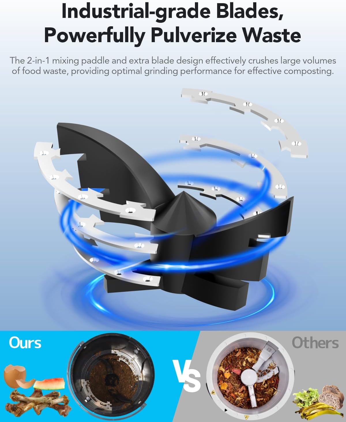 • 5.2L Large-Capacity Composter with Heavy-Duty Blades: Designed with a 5.2L large-capacity inner barrel, this compost machine meets the daily kitchen waste disposal needs of an entire family. And the extra stainless steel blades inside powerfully pulverize waste, easily handles tough food waste like eggshells, peels, chicken bones - no chunks, no clogging.