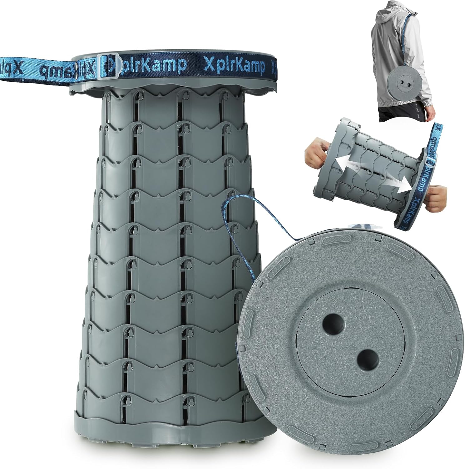 Retractable Folding Stool - Heavy Duty 400 lb Collapsible Portable Stool for Camping, Hiking, Fishing, Indoor/Outdoor with Non-Slip Base and Lightweight Design (Grey, 1-Pack)