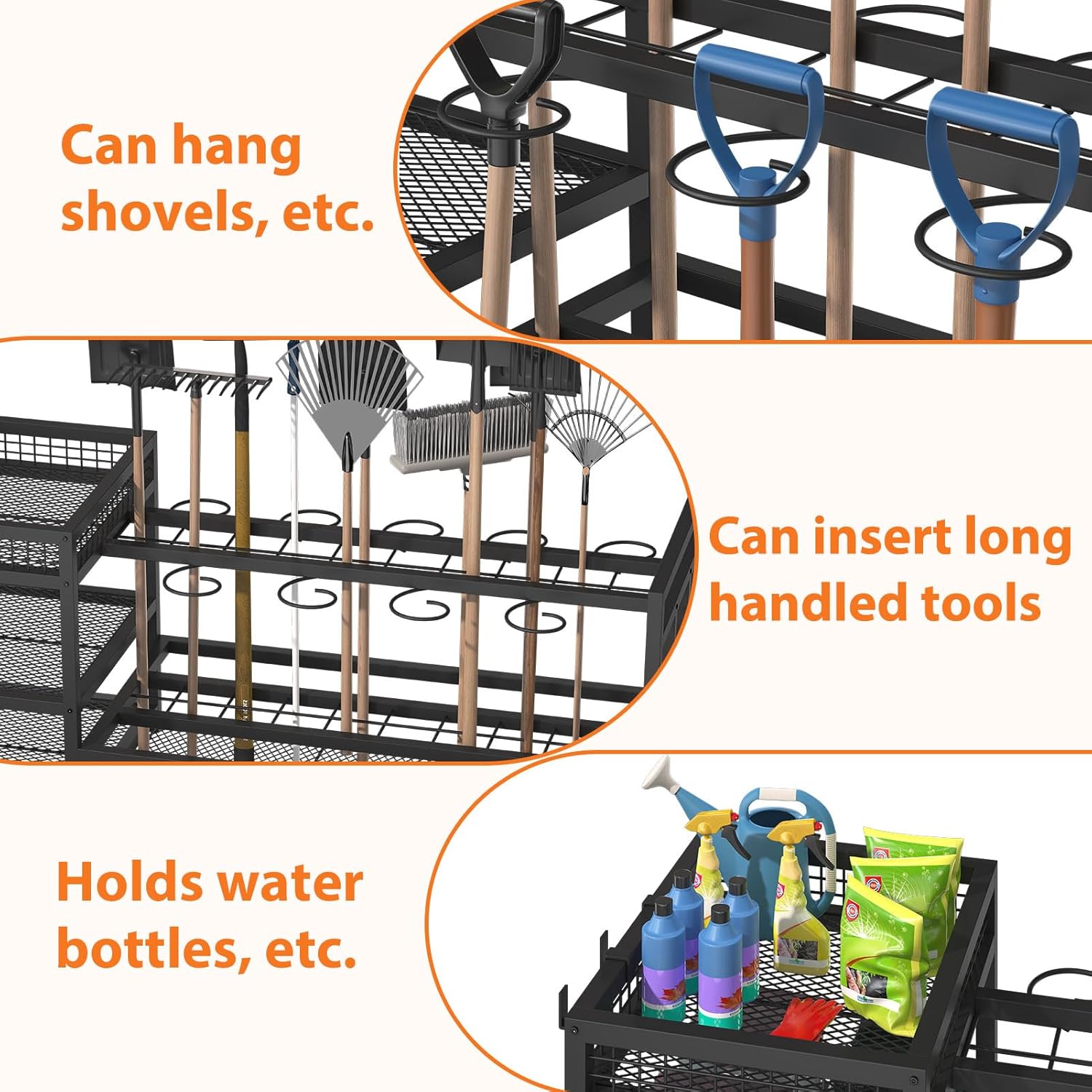 • 【Wide Range of Application】 This garden tool organizer ideal for garages, gardens, sheds, and backyards. Custom-built to store gardening, yard, cleaning, and lawn tools, it easily accommodates items like shovels, rakes farm tools, lawn tool, and also cleaning supplies like mops, brooms.