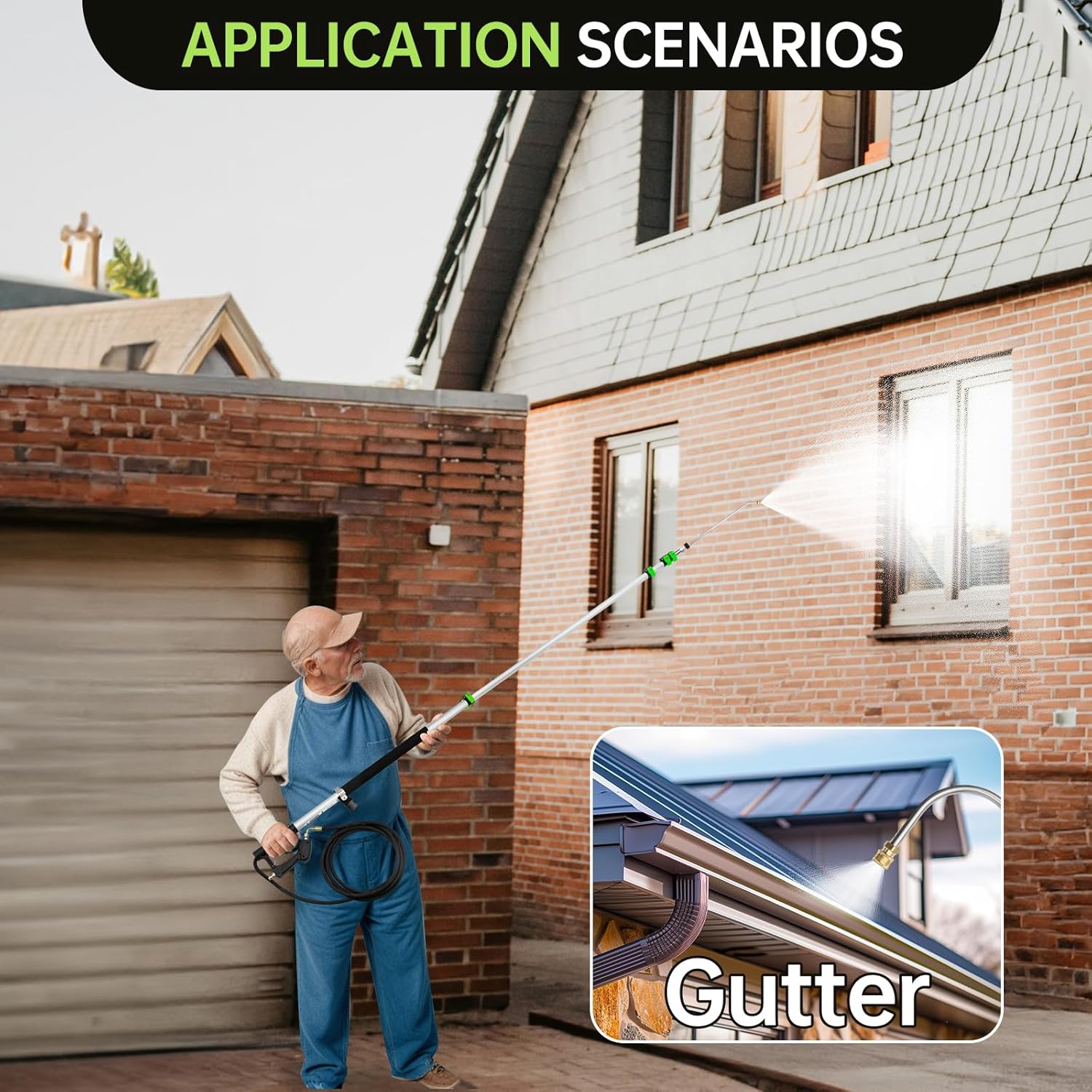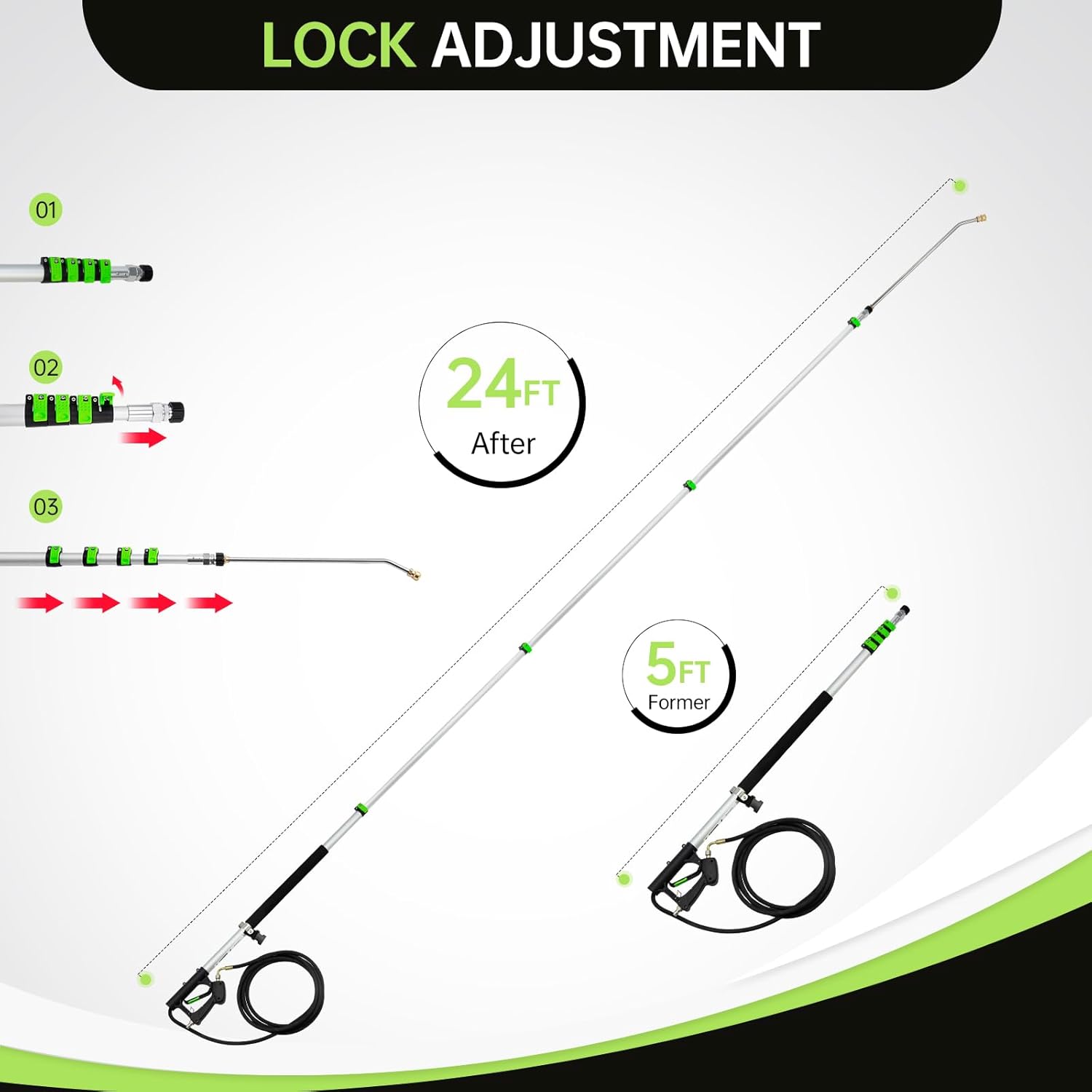 • [Professional grade equipment]: This is an extremely easy to operate Pressure Washer Telescoping Wand that can reach a height of 24 feet without the need for a ladder. Equipped with Extension Wand and brush heads, it can easily clean wall panels and drainage ditches from the ground.