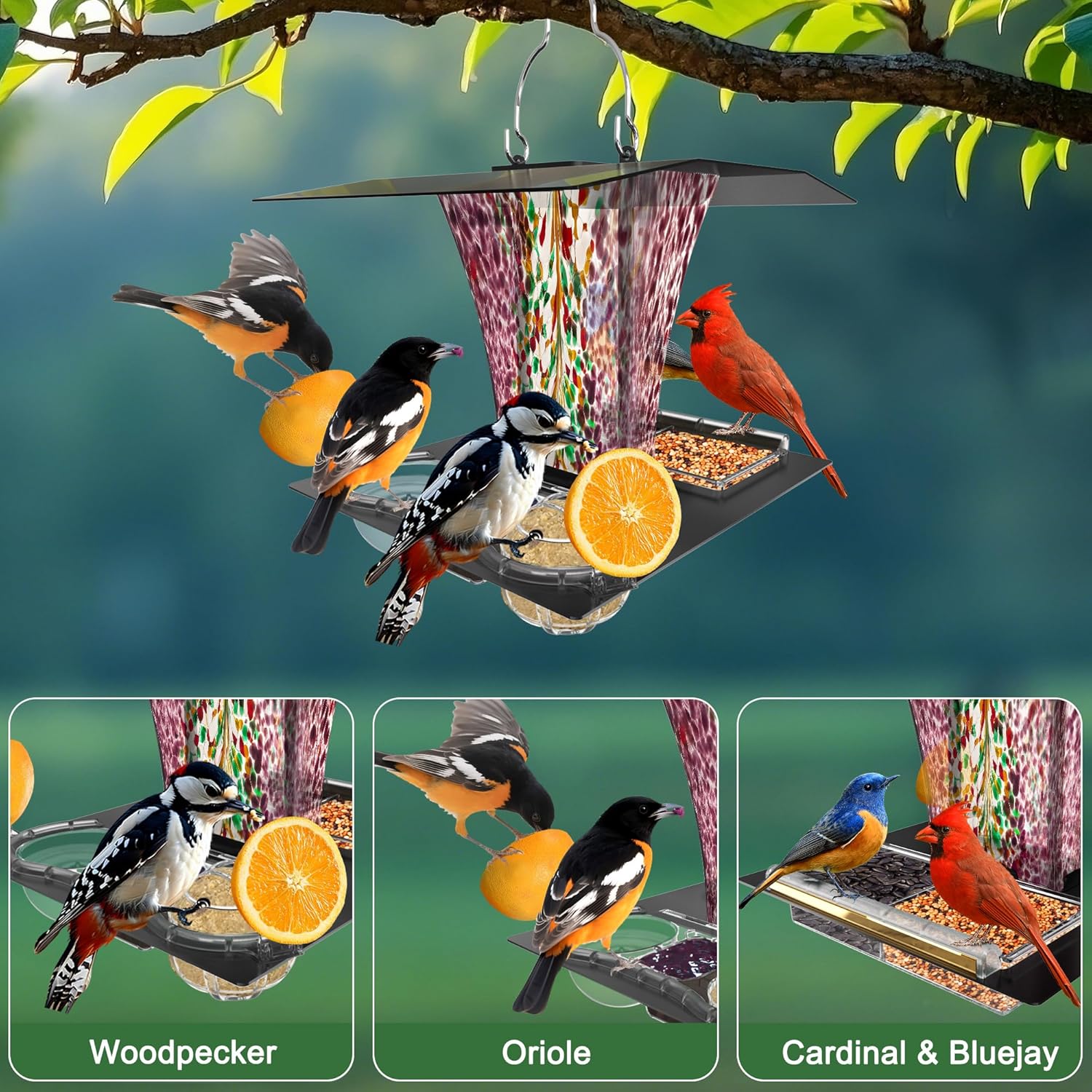 LUJII 6-in-1 Solar Bird Feeder with RGB String Lights, Hand Blown Glass, 2 Removable Trays for Bird Seed, Suet Ball, Mealworm, Oriole Orange Fruit, Jelly or Water, Purple