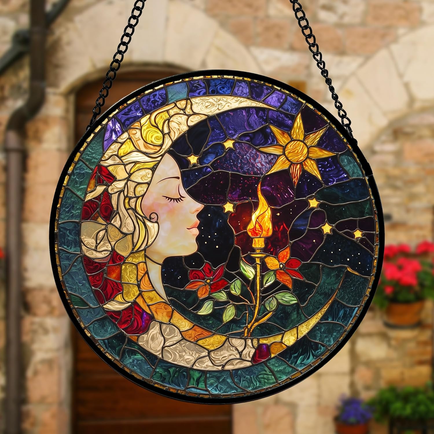 Stained Glass Window Hanging, Moon Goddess Torch Suncatcher Diamond Glass Panel Hangings Dream Sun Catchers Decor for Birthday for Women, Men, Wife, Aunt, and Mom 6.3 in