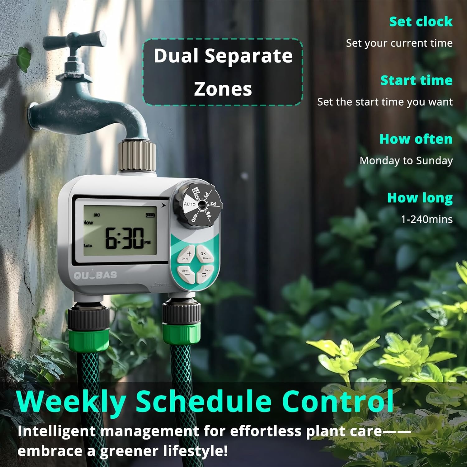 QUOBAS Weekly Plan 2 Zone Sprinkler Timer with Metal Inlet & Outlet, Water Timer for Garden Hose with Rain Delay/Manual Watering/Automatic Watering Controller System for Watering Lawn, Yard, Garden