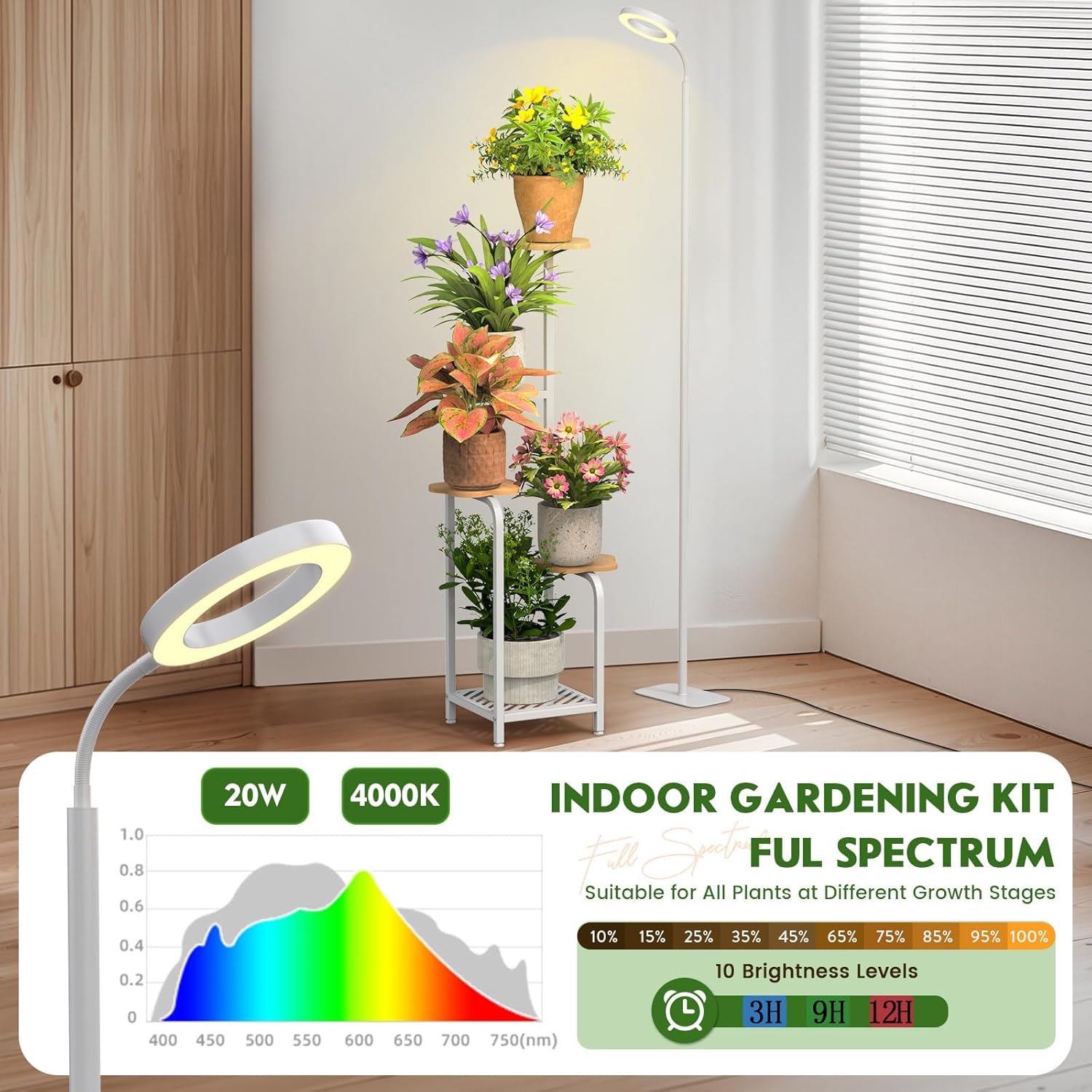 • 【Plant Stand with Grow Lights】Featuring 3 light modes (Red, Red & White, White), 10 dimming levels, and 3 timer settings (3/9/12H). Use it on a tiered plant stand to boost photosynthesis, or detach the lights as standalone desk/bookshelf lamps. The 120° beam angle, 2-head clip-on grow light has flexible goosenecks and rotatable bulbs, nourishing plants while doubling as ambient lighting. Perfect for tall displays in corners or small spaces