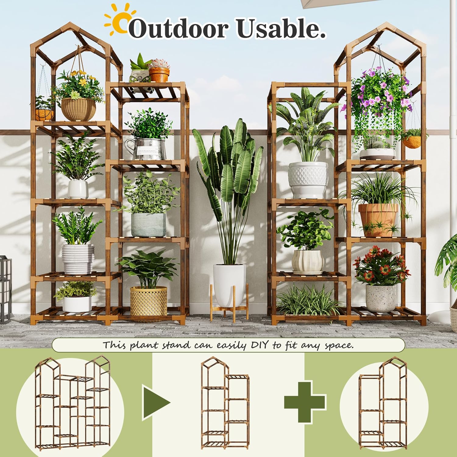 • 【Durable Carbonized Natural Wood and DIY Plant Shelves】The plant racks are made of premium wood and carbonized at high temperature, no fade, shrink, warp. This process not only extends its lifespan but also ensures it remains a healthy choice, eliminating the need for extra paint or varnish, that enhances waterproof performance and extend service life for both indoor and outdoor use. You can customize the configuration, DIY to suit your preferences! Easily switch up the overall shape of the plant stand by simply changing the connections around. You can also split or connect multiple kits together to make displays that fit your space and create your indoor garden