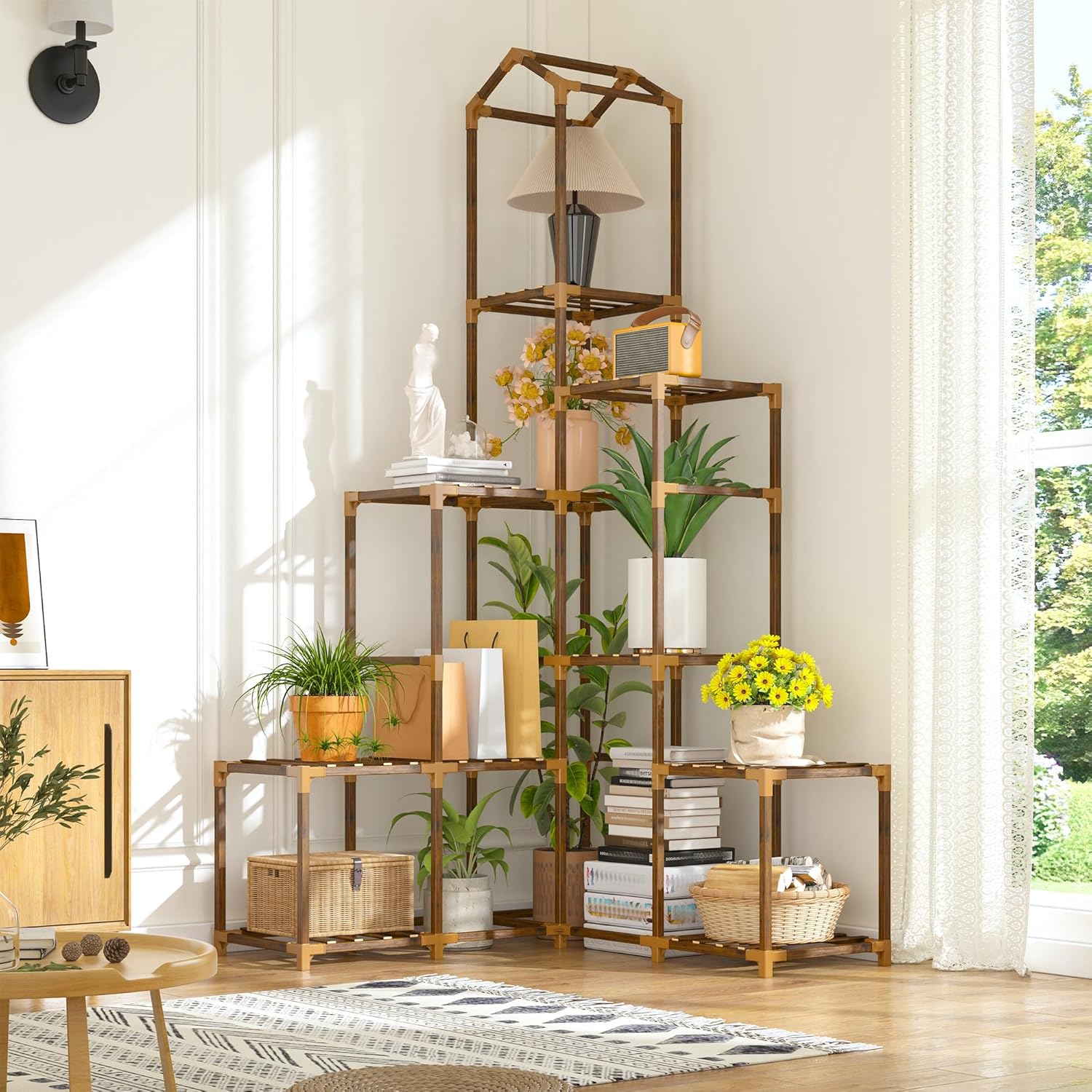 EnHomee 64.2" H Plant Stand Indoor Outdoor Tall Plant Shelf for 13-19 Pots Corner Tiered Plant Stands for Multiple Plants Wood Hanging Plants Holder for Garden Balcony Patio Window Porch
