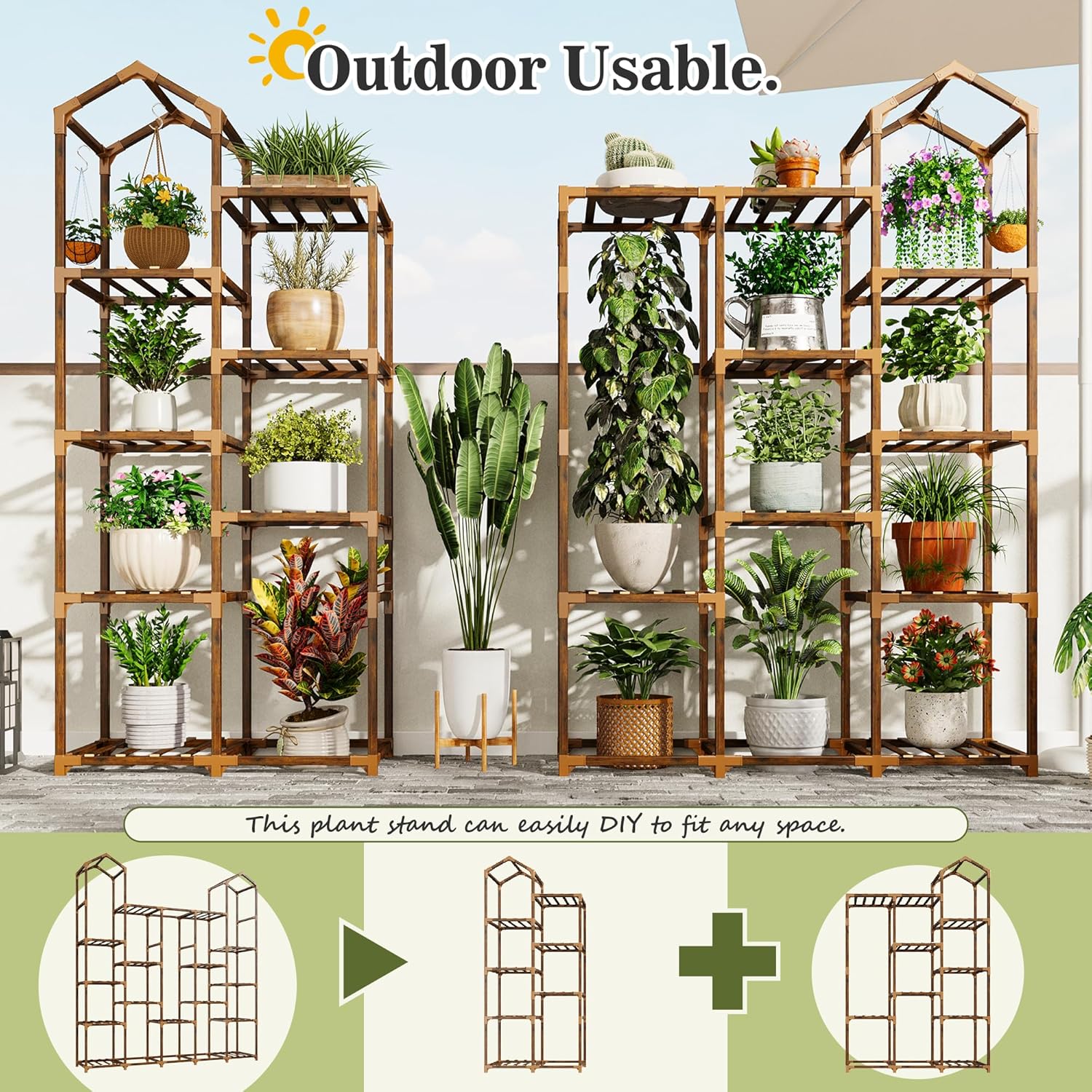 • 【Durable Carbonized Natural Wood and DIY Plant Shelves】The plant racks are made of premium wood and carbonized at high temperature, no fade, shrink, warp. This process not only extends its lifespan but also ensures it remains a healthy choice, eliminating the need for extra paint or varnish, that enhances waterproof performance and extend service life for both indoor and outdoor use. You can customize the configuration, DIY to suit your preferences! Easily switch up the overall shape of the plant stand by simply changing the connections around. You can also split or connect multiple kits together to make displays that fit your space and create your indoor garden