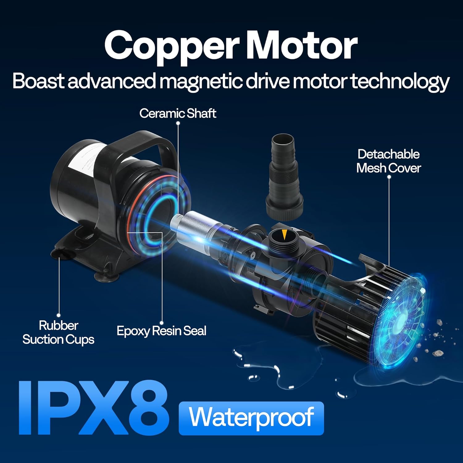 • DURABLE MATERIAL: Constructed with a sturdy ABS housing, high-quality copper motor, and a ceramic shaft, this koi pond pump is built for exceptional durability; The motor is sealed with epoxy resin, providing superior water resistance (IPX8) and insulation performance; The included nylon barrier bag effectively prevents stones and debris from entering the pump, ensuring smooth and reliable performance