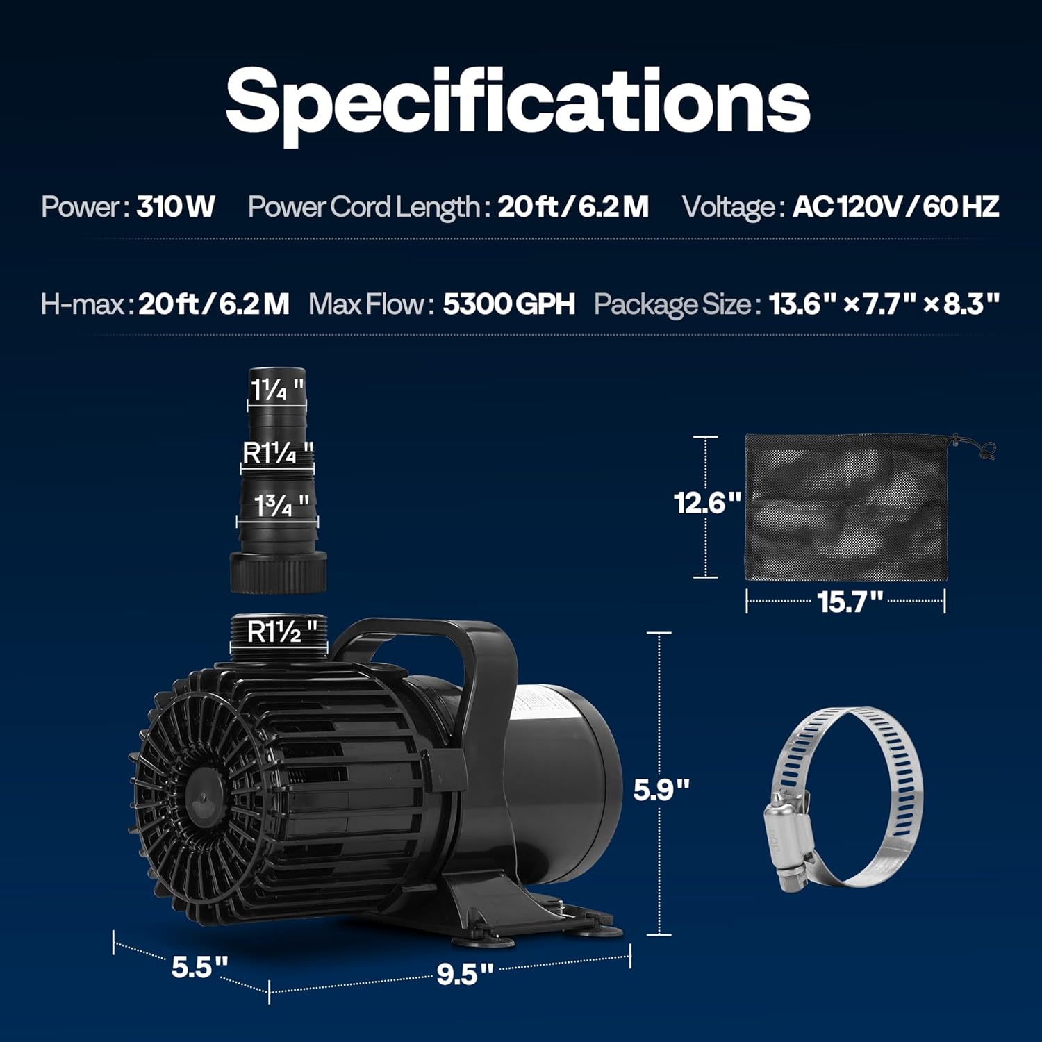 • POWERFUL AND EFFICIENT PERFORMANCE: The VIVOHOME submersible pond pump boasts a high-quality copper wire motor and employs advanced magnetic drive motor technology for exceptional performance, energy conservation, and quiet operation; The water pump has a power rating of 310 W, allowing it to lift water to a maximum height of 20 ft; It boasts an impressive flow rate of up to 5300 GPH