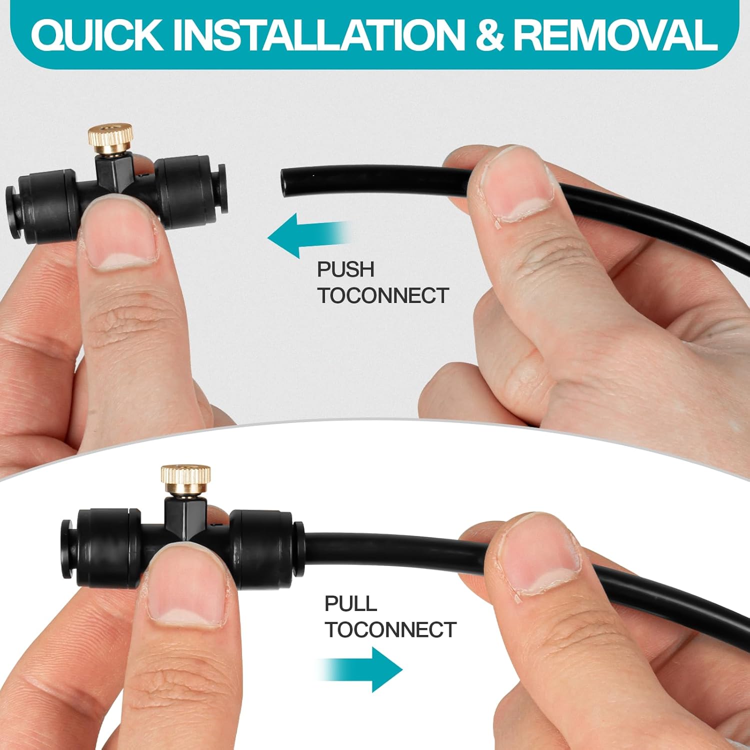 • Plug-and-Play: Our misting system for patio comes with all essential tools, like a pipe cutter and T-joints, ensuring easy installation. Whether you're a DIY pro or a novice, you can create your misting oasis in minutes, letting you enjoy outdoor fun