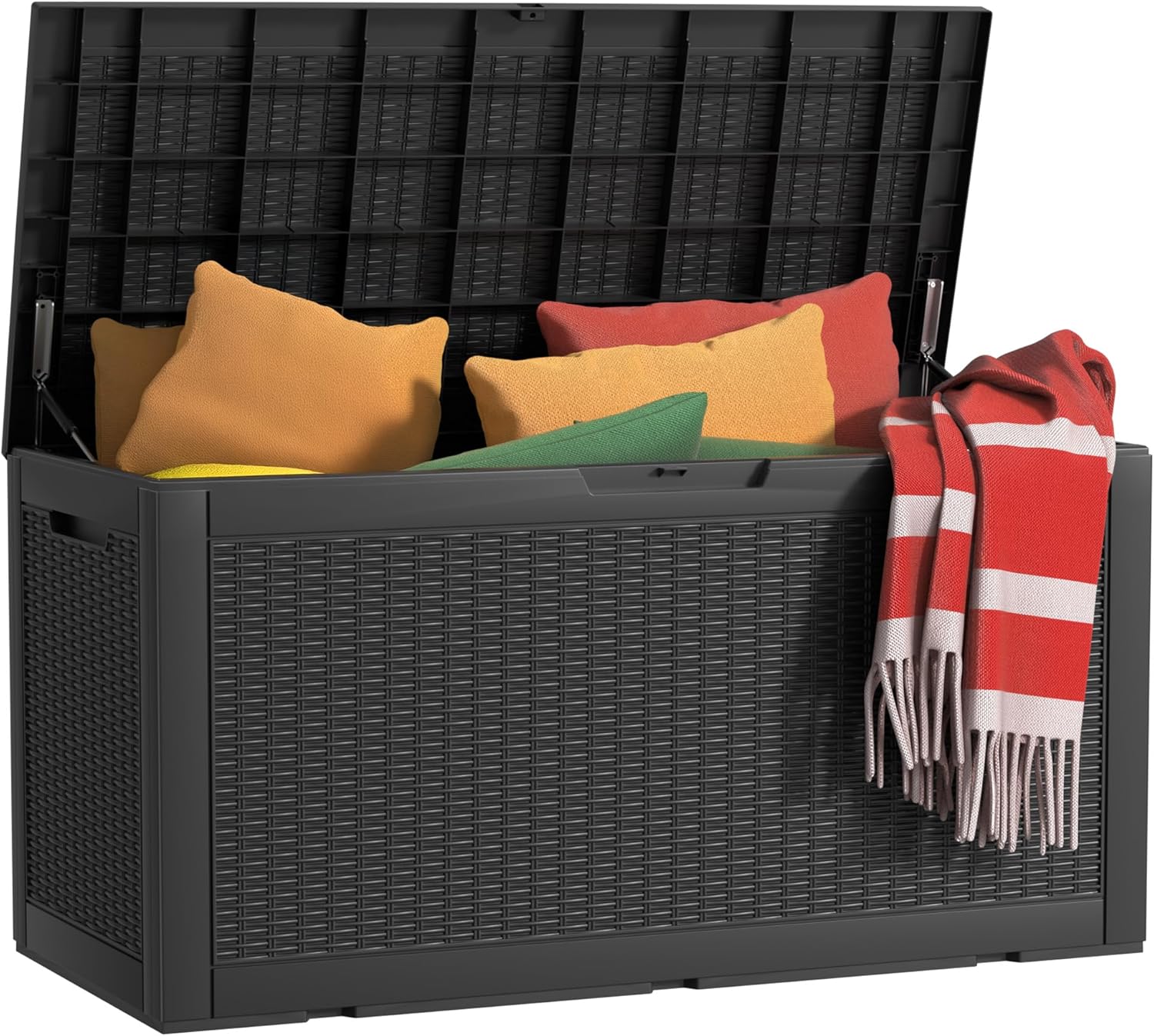 • SPACIOUS STORAGE CAPACITY:This generously sized outdoor storage box offers ample space to accommodate patio cushions, gardening tools, pool accessories, and various other outdoor items. Keep your outdoor area neat and well-organized with ease.