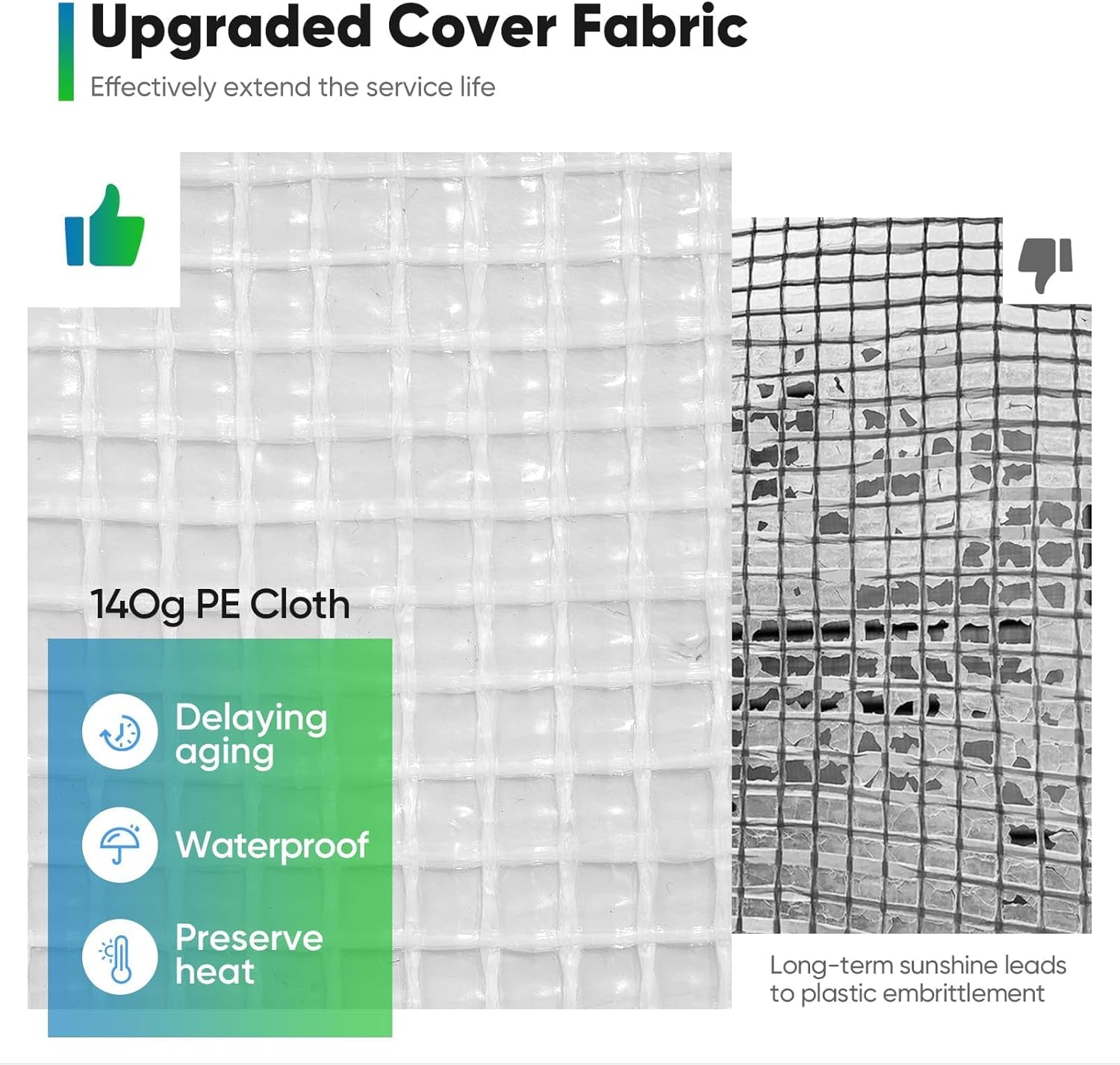• UV Protected Durable Cover - Odorless waterproof PE cover meets the UVI level 6 standard, protecting plants from sun burnt. For PE Cover Edging design, you can put weights down to seal the bottom or just bury it in the soil for heat preservation, air tightness, humidity and temperature. 3-layer stitching cover can effectively avoid tearing during use.