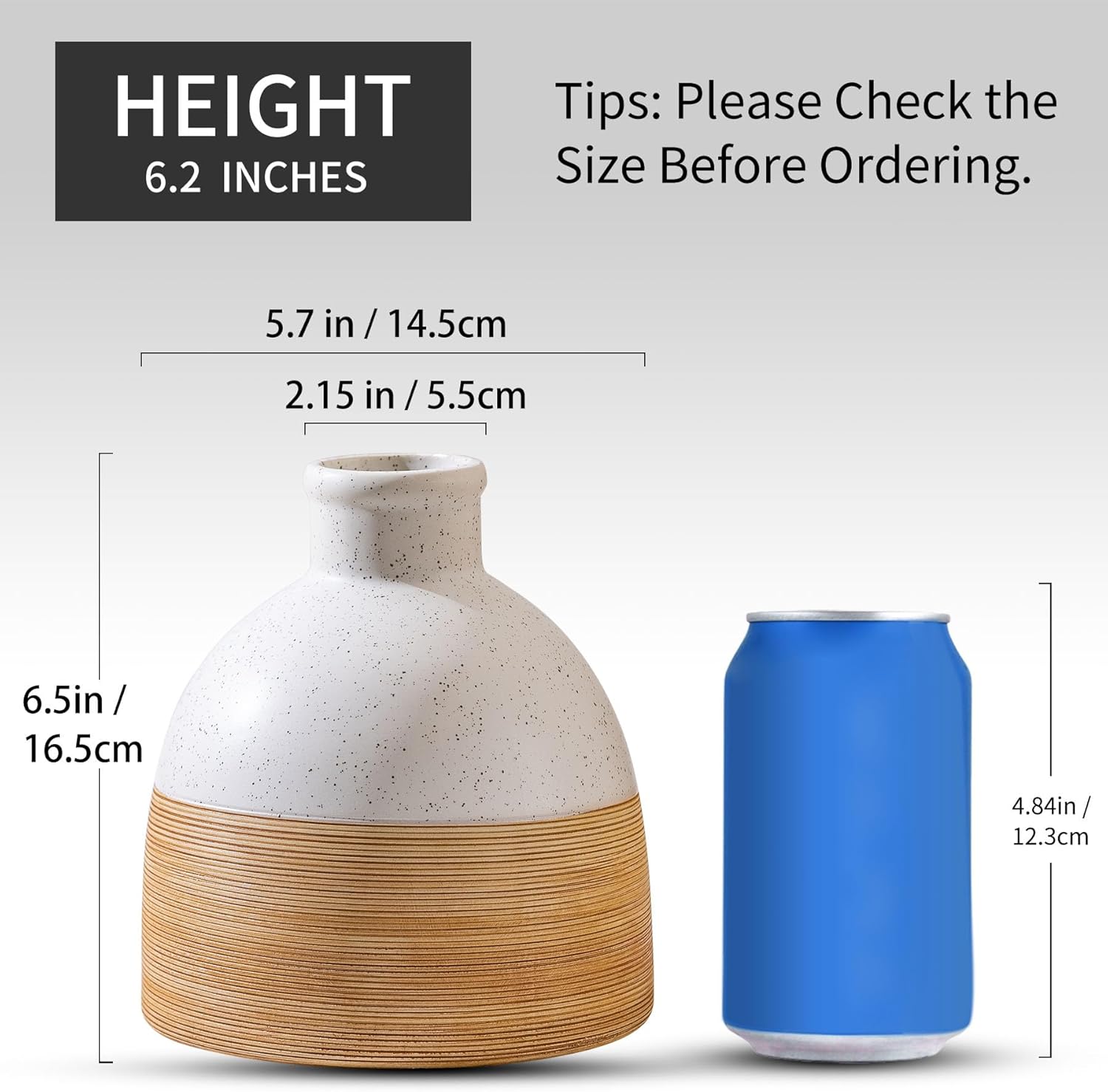 Rustic Farmhouse Flower Round Ceramic Striped Vase, Brown and White Modern Decorative Ceramic Flower Vase for Home Cottage Core Decor, Table, Living Room, Bookshelf Decor, Mantel, Wedding 6.5 Inch