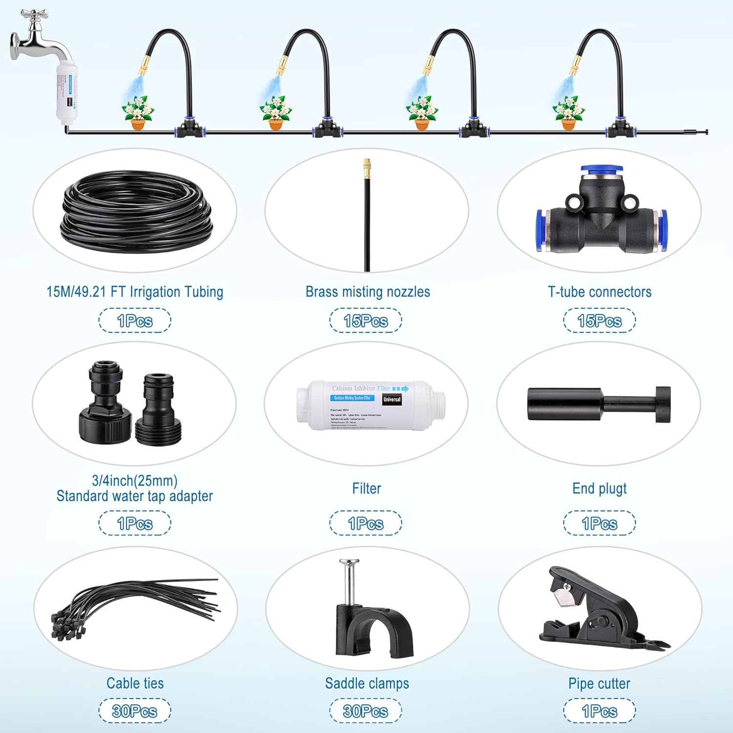 Mornajina Automatic Drip Irrigation Kits Garden Irrigation System, Includes Calcium Inhibitor Filter & 50FT 5/16 inch Irrigation Tubing Hose & 15Pcs 360° Bending Dropper Atomizing Mist Nozzles Tee