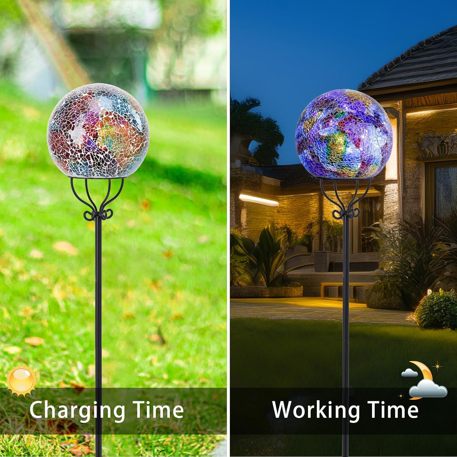 • Unique Design: Solar garden light is designed with mosaic glass globe ball, which lights up beautifully and looks fabulous! Garden lights enough to create a romantic atmosphere for you and attract your neighbor's eye to your yard