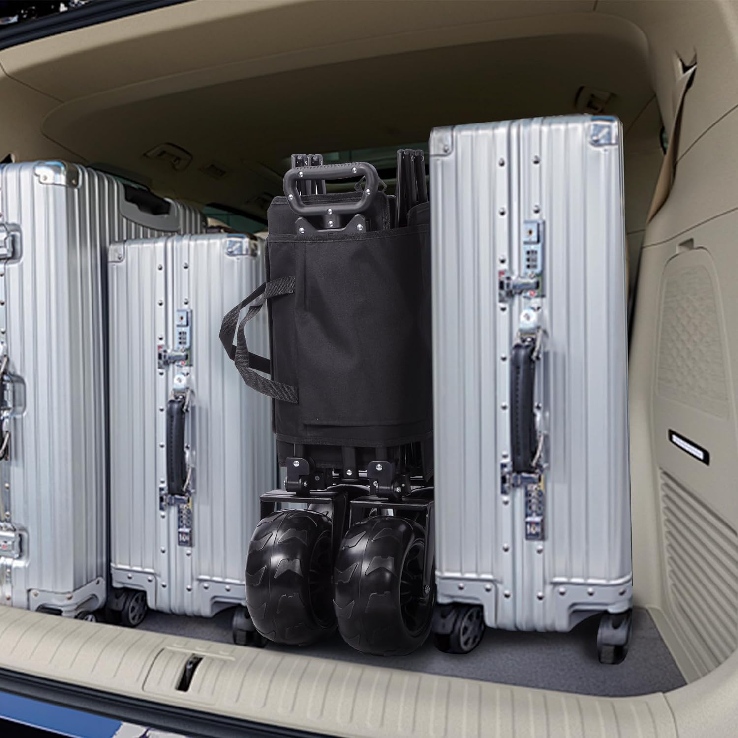 • 220L Large Capacity: Boasting dimensions of 35.6"L x 20.3"W x 13"D, this collapsible beach wagon delivers an expansive 220-liter storage space, effortlessly accommodating gear for beach days, camping trips, sports events, grocery hauls, or garden projects. Its deep, roomy design ensures even bulky items like coolers, chairs, and umbrellas stay securely stowed