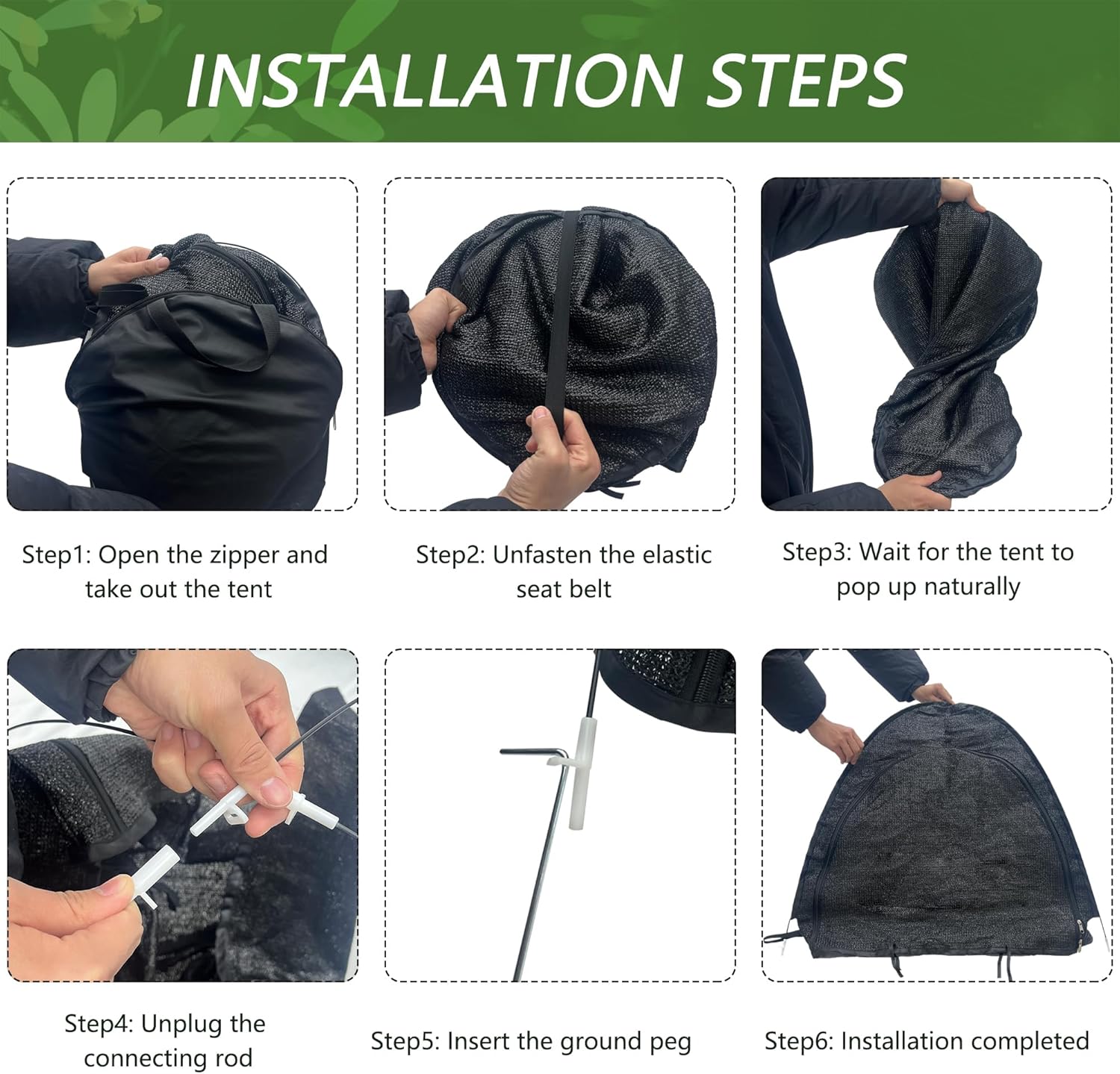 • Unique Design: UV resisitant plant cover tent adopts pop-up design, easy to assemble and use, and more stable and safe to insert the stakes into the ground. The garden shade tent is designed with double zippers on one side, which is convenient for moving potted plants, pruning branches and leaves, picking fruits and so on.