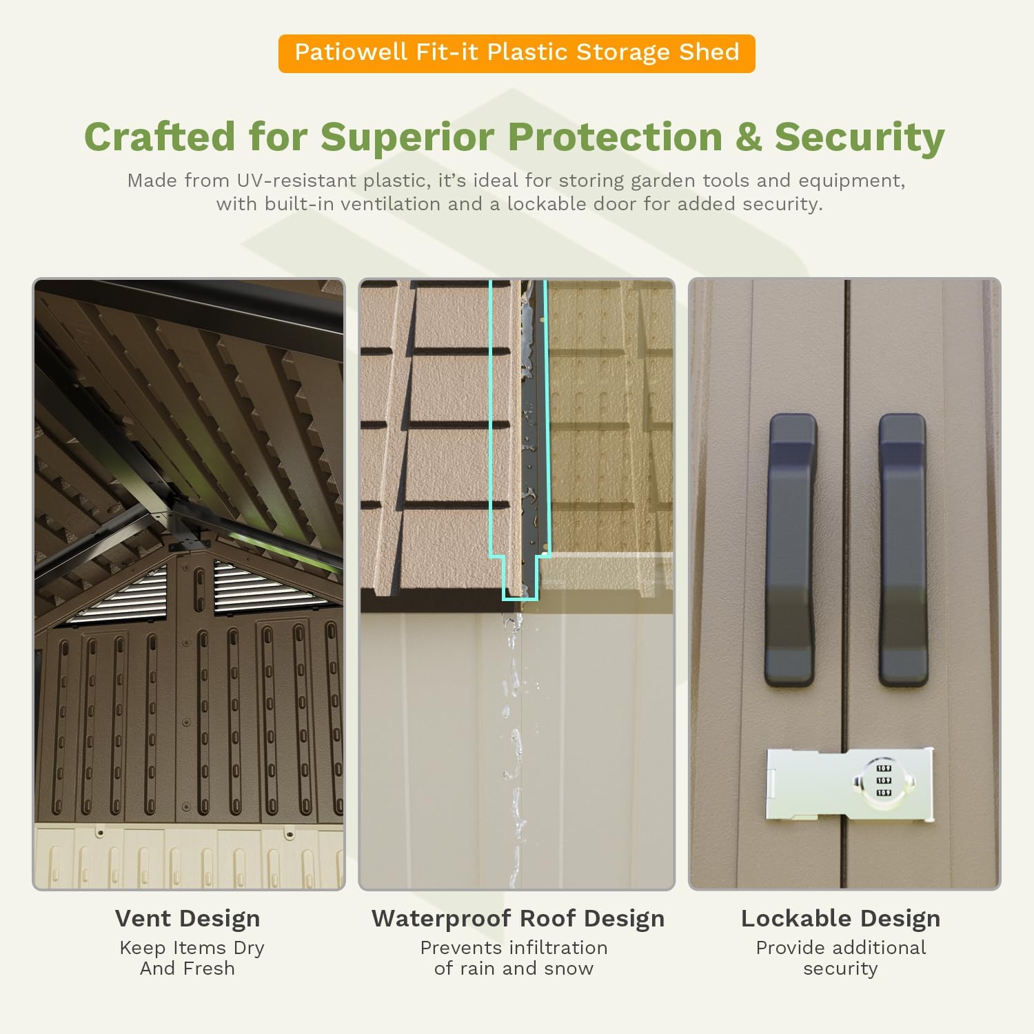 Patiowell 8 x 10 FT Resin Outdoor Storage Shed with Floor, Plastic Shed with Window and Lockable Door for Garden, Backyard, Tool Storage Use, Easy to Install in Brown (Kick-it Shed)