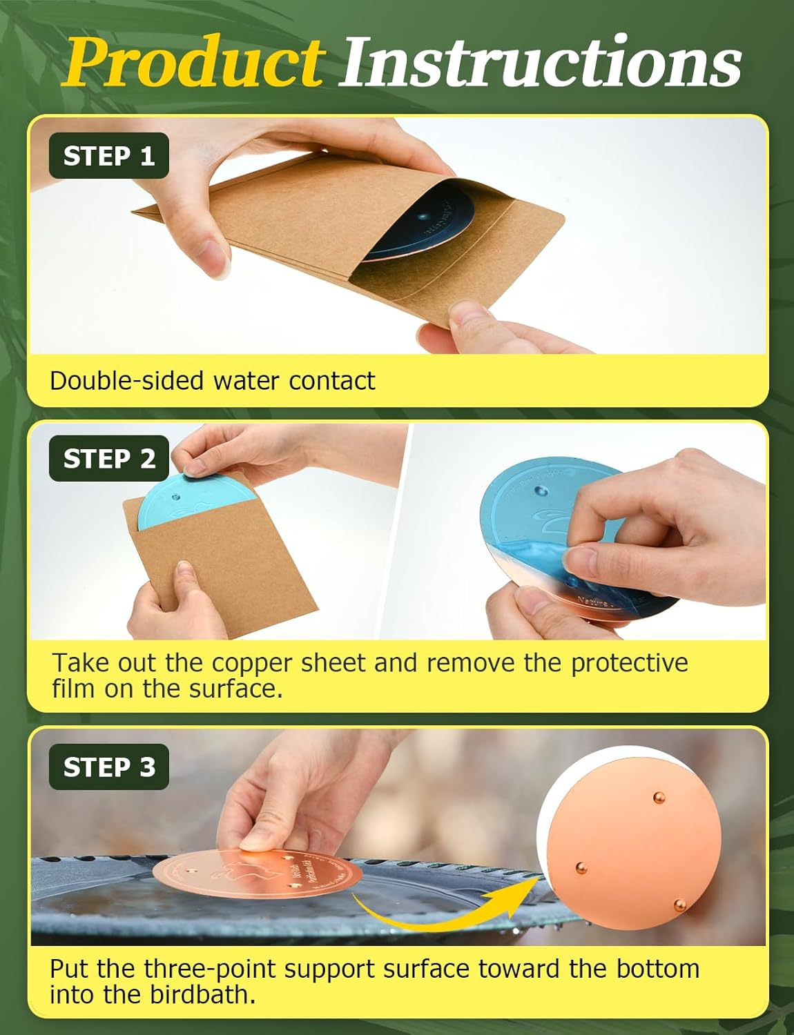 • Compatibility Notice: Bird bath copper disc function only with non-metallic basins including stone, plastic, nylon, or composite materials. Do not use with metal basins (alloy/iron). Metal reacts with copper ions, neutralizing the copper's efficacy.