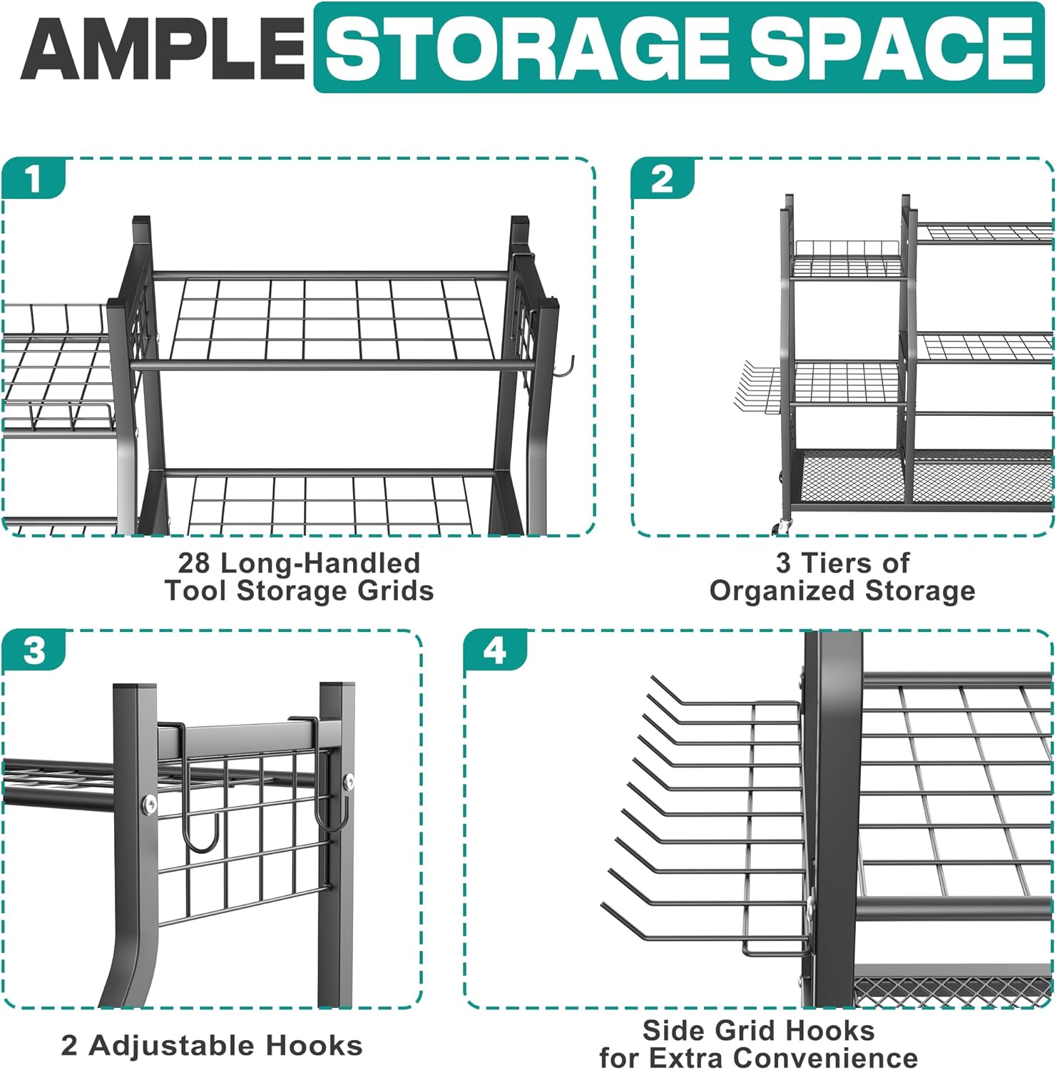 • Rust-Proof Coated Metal Construction: Built with all-metal construction and rust-proof coating, this yard tool rack is corrosion-resistant and durable, designed for heavy-duty storage and long-lasting use