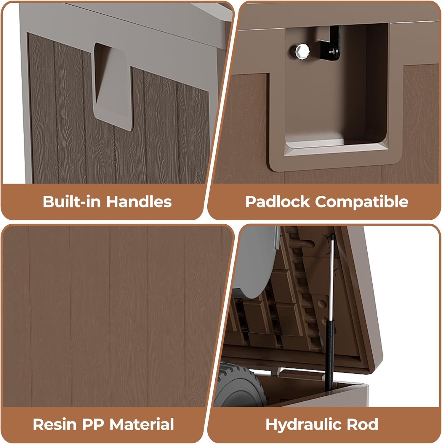 • Unrivaled All-Weather Resilience: This resin deck box is engineered with an all encompassing all-weather design. Its surface showcases an aggregate resin finish paired with a charming wood grain pattern. This isn't just about good looks; this combination is a masterstroke of functionality. It acts as a formidable shield against water, UV radiation, color fading, rust formation, surface peeling, and material warping. Thanks to these robust features, it demands minimal upkeep over the years. Wheth
