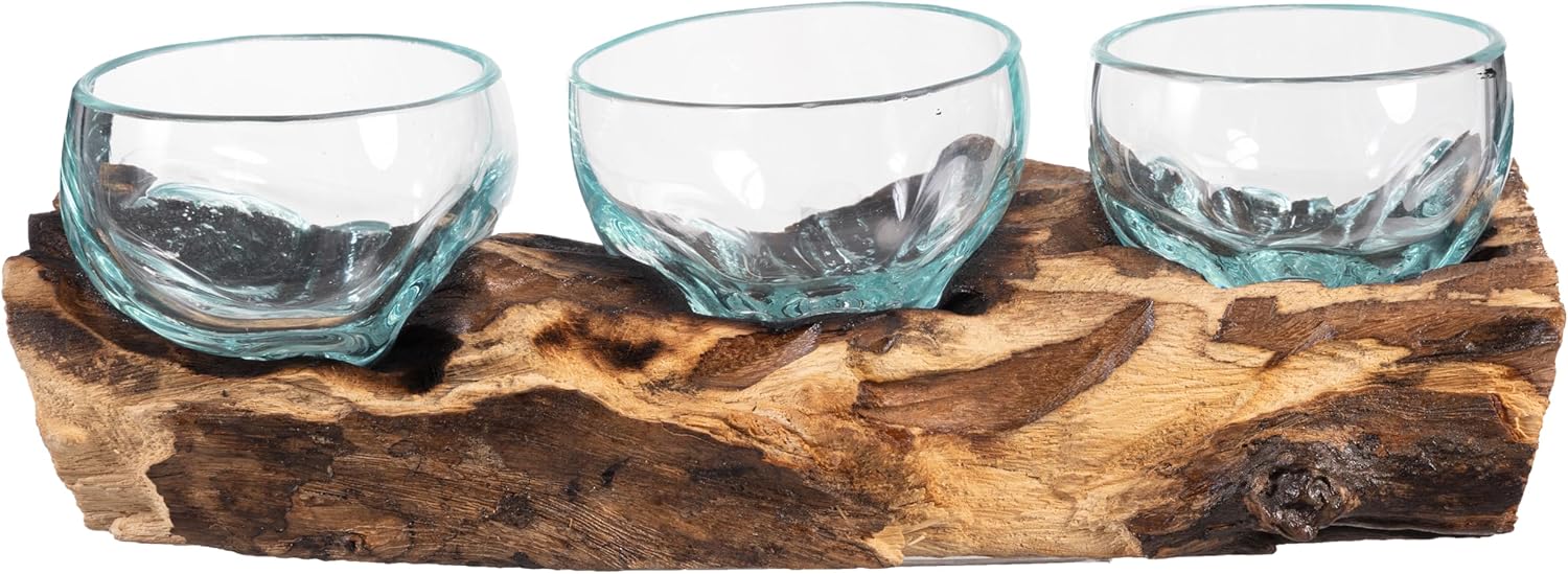 • ONE OF A KIND: Because each beautiful planter display is hand-made, each is unique. To assemble: simply set the glass topper on the driftwood base in the natural grooves of the base. The item is constructed by pressing the glass into the base, so each has a unique formation. Once correctly aligned, it will be a perfect fit! Simply place the glass to the base and you are all set to start displaying! Approximate overall size: 4"H x 13"L x 6"W, with 3 terrariums measuring 3.5" Diameter.