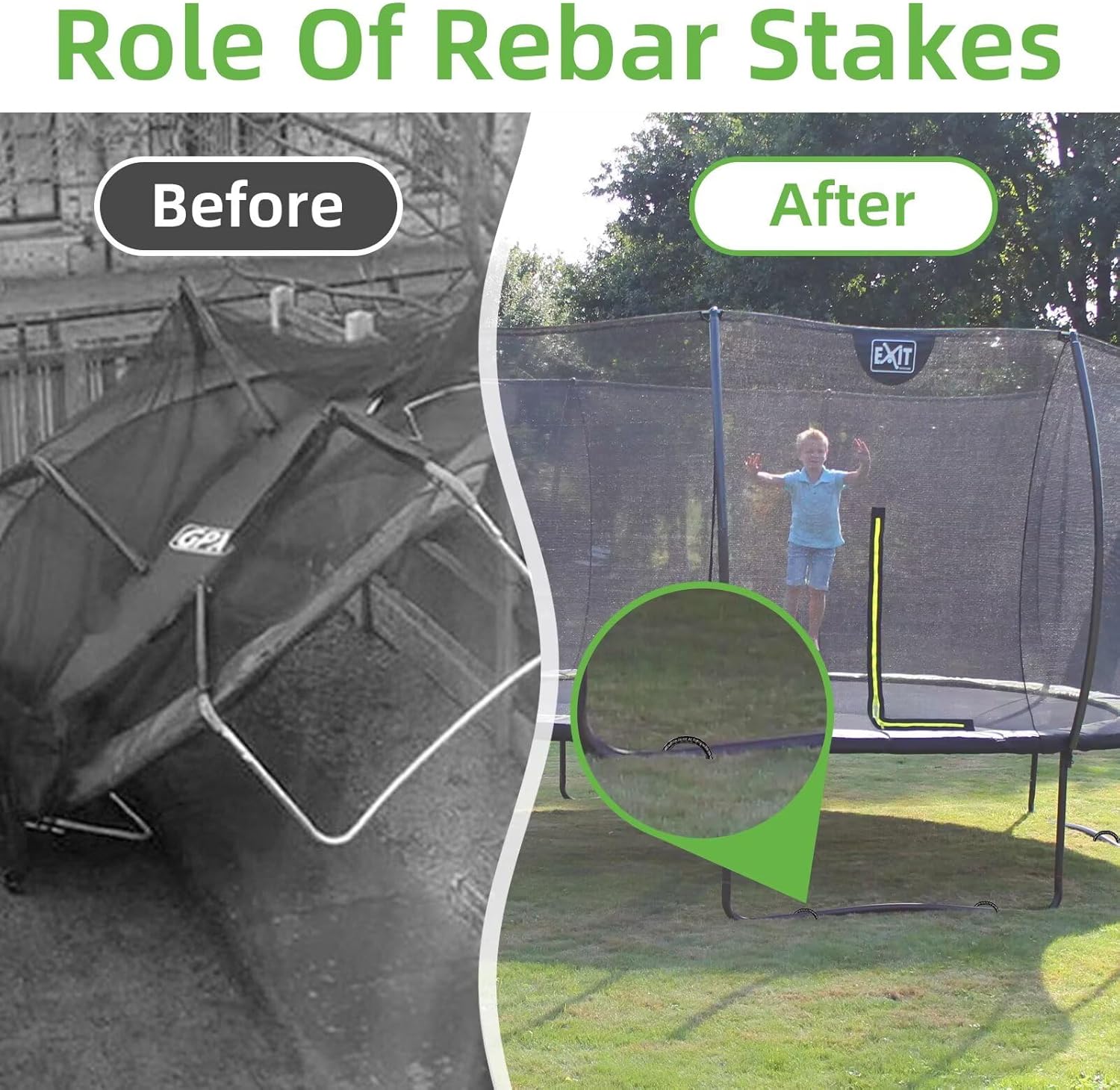 • 【Quality】Our Trampoline Rebar Stakes Crafted From Heavy-Duty Steel for Strength And Durability. They Feature A Black Powder Coating Galvanizing To Prevent Rust And Corrosion,Ensuring They Remain Reliable And Long-Lasting In Outdoor Use. These Ground Anchors Are Designed To Resist Weathering From Wind And Rain, Providing Years Of Service. Their Sturdy Construction Means They Won'T Bend Easily And Can Be Reused Multiple Times.