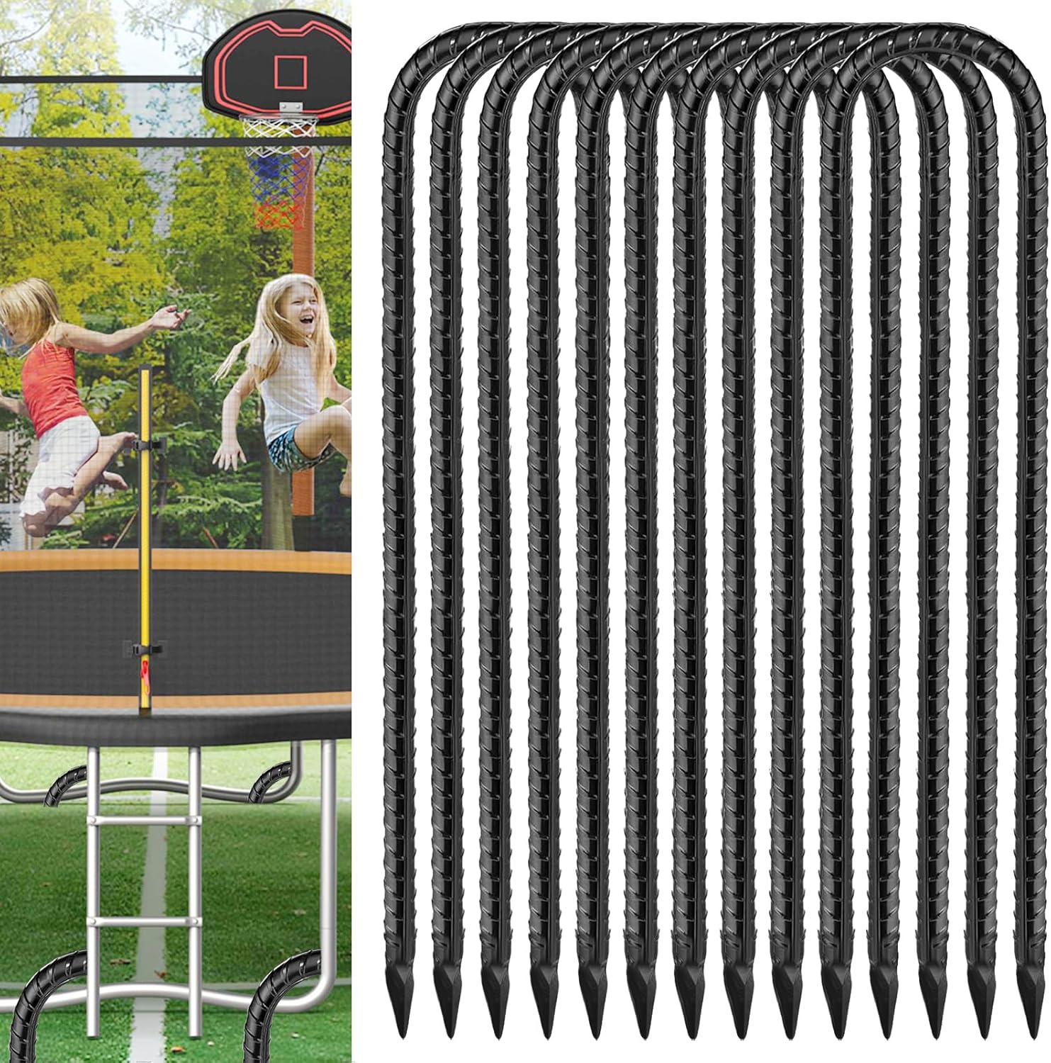 • 【U Hook Rebar Stakes 16 Inch】The Package Includes 10 U-Hook Rebar Stakes, Each 16 Inches Long From Tip To Hook With A 3/8 Inch (10mm) Diameter, And A Hook Spacing Of 1.97Inches. Are Designed For Holding Trampolines, Swing Sets, Soccer Goals, Camping Tents, And Chain Link Fences. The Black, Heavy-Duty Tent Stakes Are Compatible With All Types And Sizes Of Trampolines And Outdoor Tents, Ensuring They Stay Securely In Place During Strong Winds.