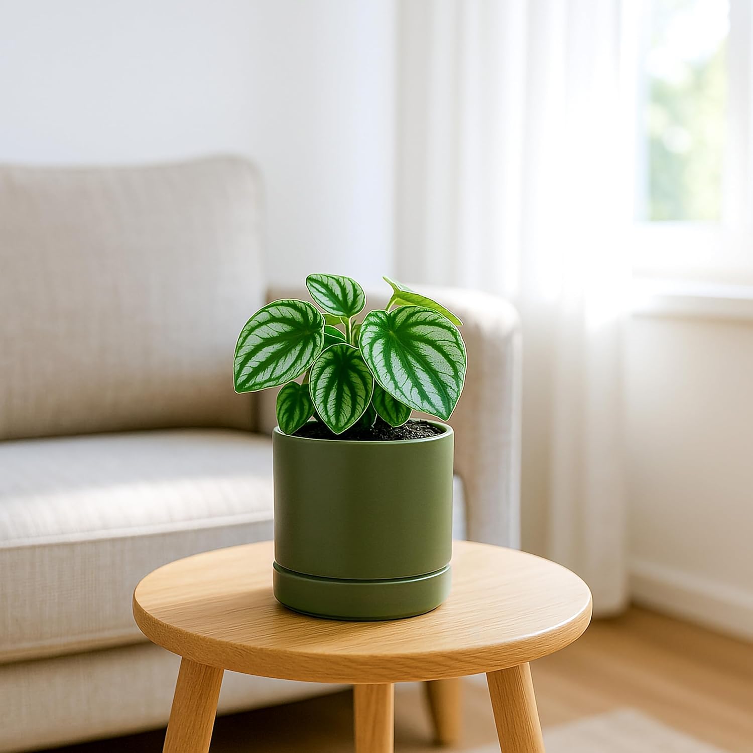 D'vine Dev 4.7 Inch Ceramic Planter Pot with Drainage Hole and Saucer, Indoor Cylinder Round Planter Pot, Olive, 94-O-B-J