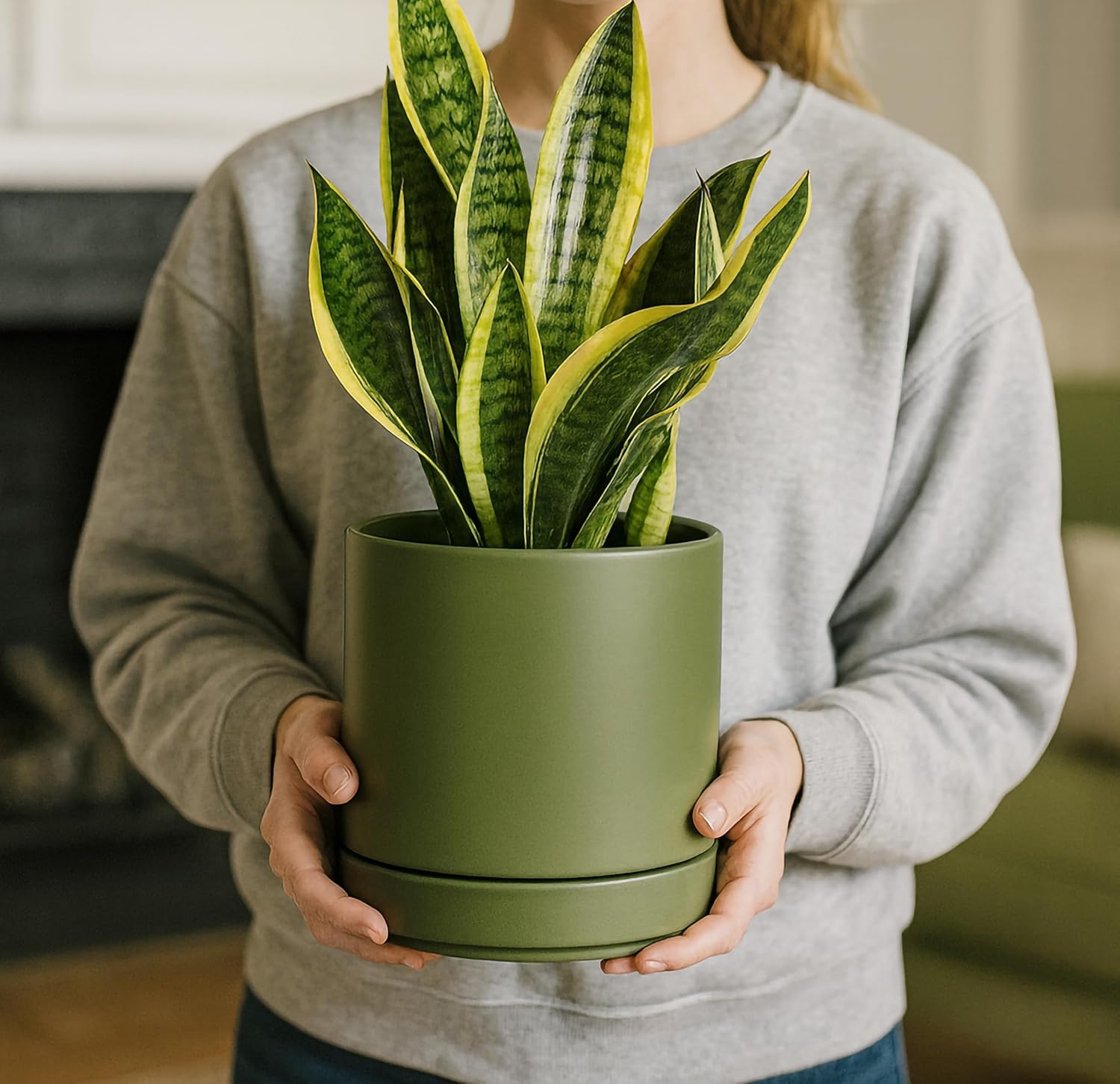 D'vine Dev 6.5 Inch Ceramic Planter Pot with Drainage Hole and Saucer, Indoor Cylinder Round Planter Pot, Olive, 94-O-C-J
