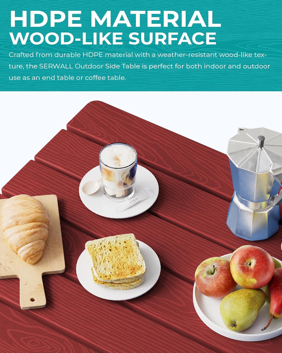 • [Low Maintenance Beauty] The SERWALL outdoor end table's wood-textured HDPE surface requires no painting or staining. A simple soap and water clean ensures a pristine look, making it the ultimate in easy maintenance.