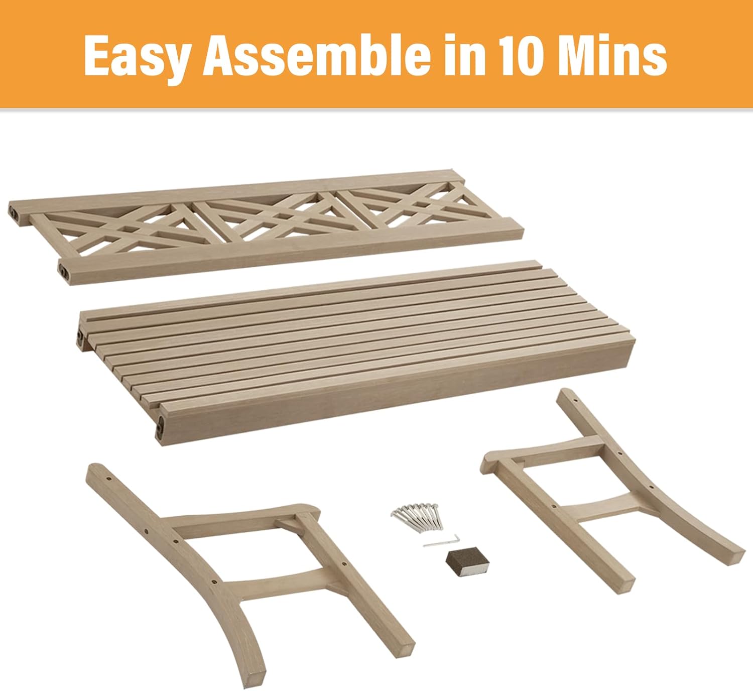 • Quick and Easy Assembly Designed for convenience, this 2-person bench comes with 4 pre-assembled pieces and 8 identical screws. Follow the included manual, and you’ll have your eco-friendly outdoor bench ready in just 10 minutes. All necessary installation tools are included for a stress-free setup.