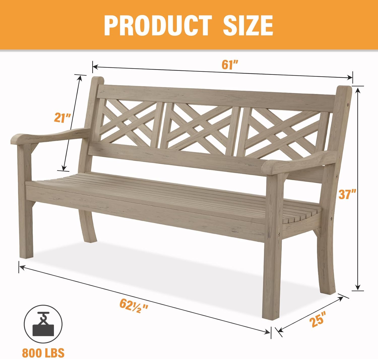 Psilvam 63''W All-Weather Poly Lumber Outdoor Bench – Teak Color, 3-Person Garden Bench with Decorative Backrest & Curved Armrests, Anti-Rot & Fade-Free Patio Bench for Porch, Backyard, and Park(Grey)