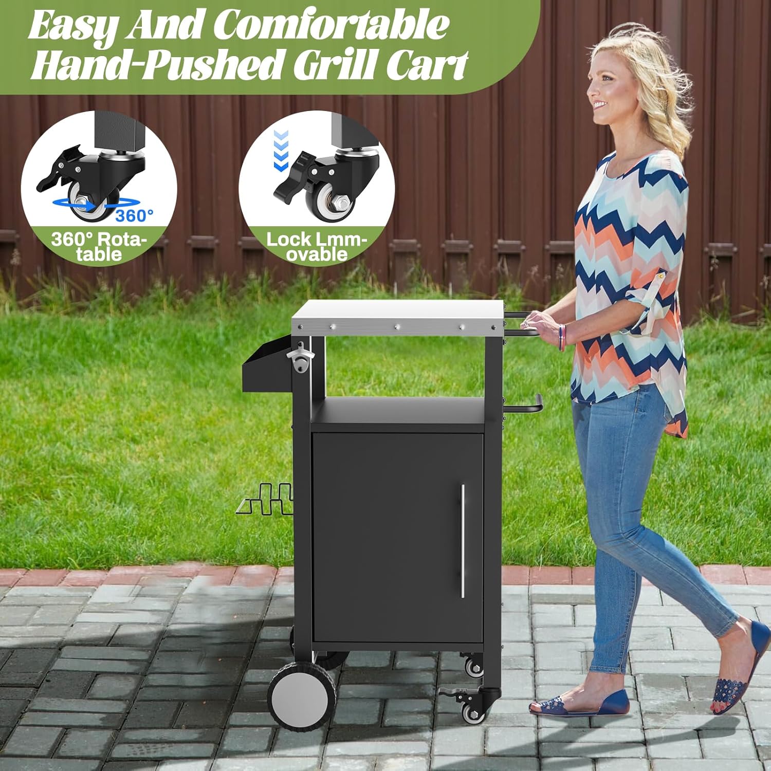 • STURDY AND DURABLE MATERIALS - Gill cart features heavy-duty square tube legs and a stainless steel tabletop, which is very stable and durable.The stainless steel tabletop provides a safe work surface that is easy to clean and maintain.The cabinet is designed with double walls and single doors on one floor-walled single door to store barbecue fuel, including propane tanks, charcoal, or wood chips. This outdoor bar cart is an outdoor entertainment necessity. Measuring 18.1"D x 18.1"W x 34.5"H