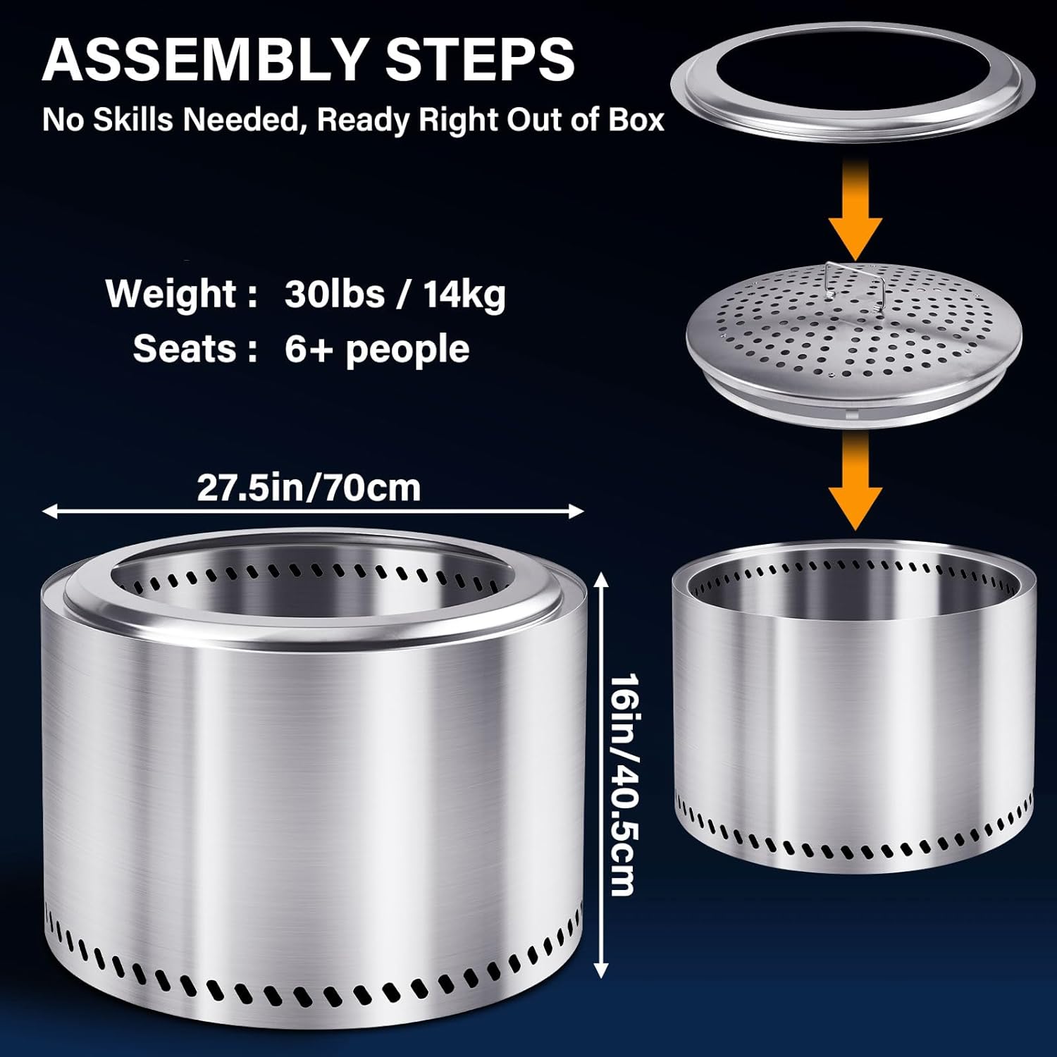 HGD 27.5" Smokeless Fire Pit Outdoor, Stainless Steel Wood Burning Firepit with Secondary Combustion, Backyard Patio Stove for Garden, BBQ & Bonfire